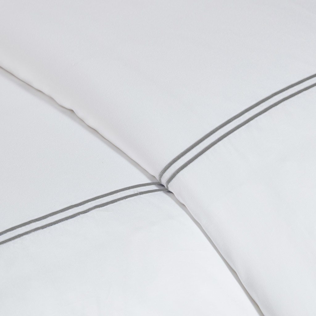 DescriptionMake every night feel like a luxurious hotel escape with this 500 Thread Count comforter set. Made of soft cotton, this refined 5 piece set features a double-row striped embroidered border for an elegant finish. The duvet cover is removable and has corner ties with a zipper closure for easy care. This set is also OEKO-TEX certified, meaning it does not contain any harmful substances or chemicals to ensure quality comfort and wellness.Product DetailsKing/Cal King1 Duvet Cover:108"W x 96"L1 Comforter Insert:110"W x 98"L2 King Shams:20"W x 36"L + 2"D (2)1 Throw Pillow:12"W x 16"LMaterialDuvet Cover: 500TC cotton sateen embroidery face and back, knife edge, zipper closure at bottom, inner corner tiesSham: 500TC cotton sateen embroidery face and back, 2" flange, zipper closureInsert: 100% polyester microfiber face and back, knife edge, down alternative polyester fiber fill 50 oz, box quilting, corner loopsPillow: 500TC cotton sateen face and back, embroidery on face, down alternative polyester fiber fill