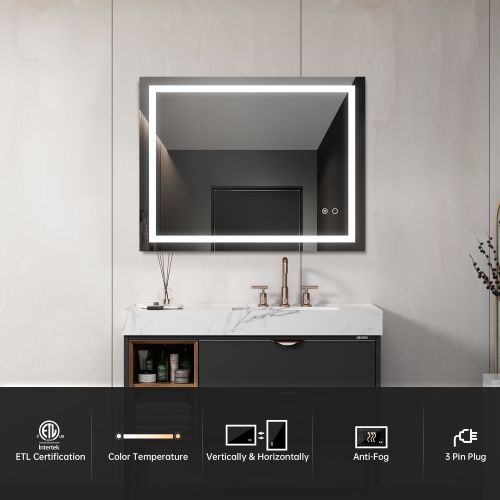 LED Lighted Bathroom Wall Mounted Mirror with High Lumen+Anti-Fog Separately Control+Dimmer FunctionLED Mirror with Touch Buttons controlCERTIFICATION: ETL5mm copper free high quality mirrorUL certified SMD 2835 LED Belts 120 chips per meter ,UL certified driver35mm aluminum frame, PVC back panel fully coveredInstallation kits are includedTwo Buttons Touch SensorInnovative and attractive touch sensor for light and defogger1.One button: on/off/ dimmer/ heater2.One button: Short press: CCT changeable, Long press:CCT dimmer, 0~100%Anti-Fog LED bathroom Vanity MirrorSingle button control, not only is it safe and energy-saving, you can also adjust according to your requirement. Meanwhile, clear the steam on the mirror in 15 seconds, no need to worry about the foggy anytimeAdjustable Color TemperatureShort touch(