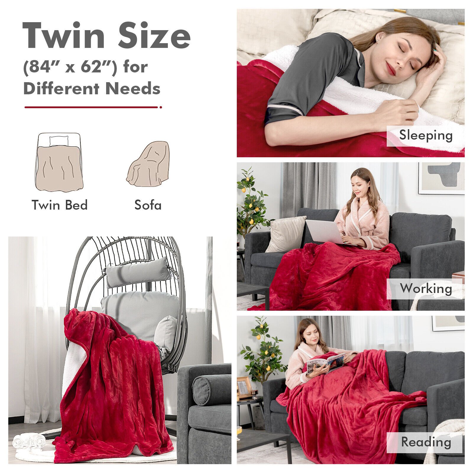 Enjoy a warm embrace with this twin-size heated blanket! Measuring 84" x 62" (L x W) in size this heating blanket with 10H auto shut-off provides you with a large coverage area whether you are sleeping or working. And this heating blanket is constructed of a soft flannel cover fast heating wires and skin-friendly Sherpa fabric to bring maximum comfort while distributing the heat evenly. Moreover you can choose the suitable temperature from 5 heating levels based on your preference. And the built-in thermostat will keep the heated blanket at the temperature you set. Please don't worry about any security issues. The ETL and FCC approved heating blanket features overheat protection and electrocution prevention function for safe protection. If you want to make this heating blanket brand new just disconnected the 14.5 ft power cord and then put the blanket into the machine for easy cleaning. If you are looking for an electric blanket like this do not hesitate to place an order! Safe to use with overheat protection and electrocution prevention ETL certification and FCC certification for additional safety Provide you with even heating quickly and efficiently with fast heating wires Easily adjust between 5 heat levels from 84℉ to 108℉ through the controller Will automatically shut off after 10 hours of operation Built-in thermostat for uninterrupted warmth and energy-saving Soft flannel cover and skin-friendly Sherpa fabric for ultimate comfort Flexible to use thanks to the 14.5ft power cord Disconnect the power cord for machine washing Serve as a quilt or blanket for bed or sofa with twin size (84" L x 62" W) Can be used as a normal blanket by disconnecting the controller