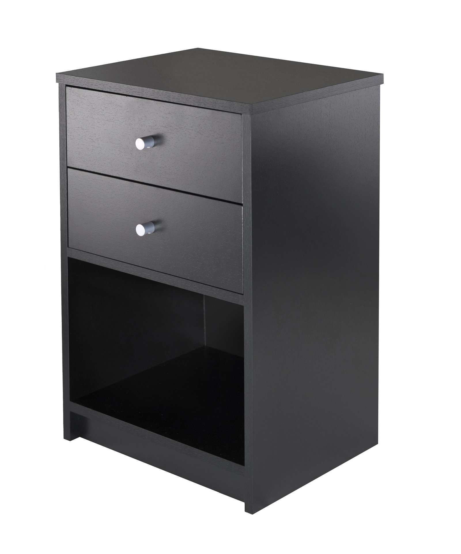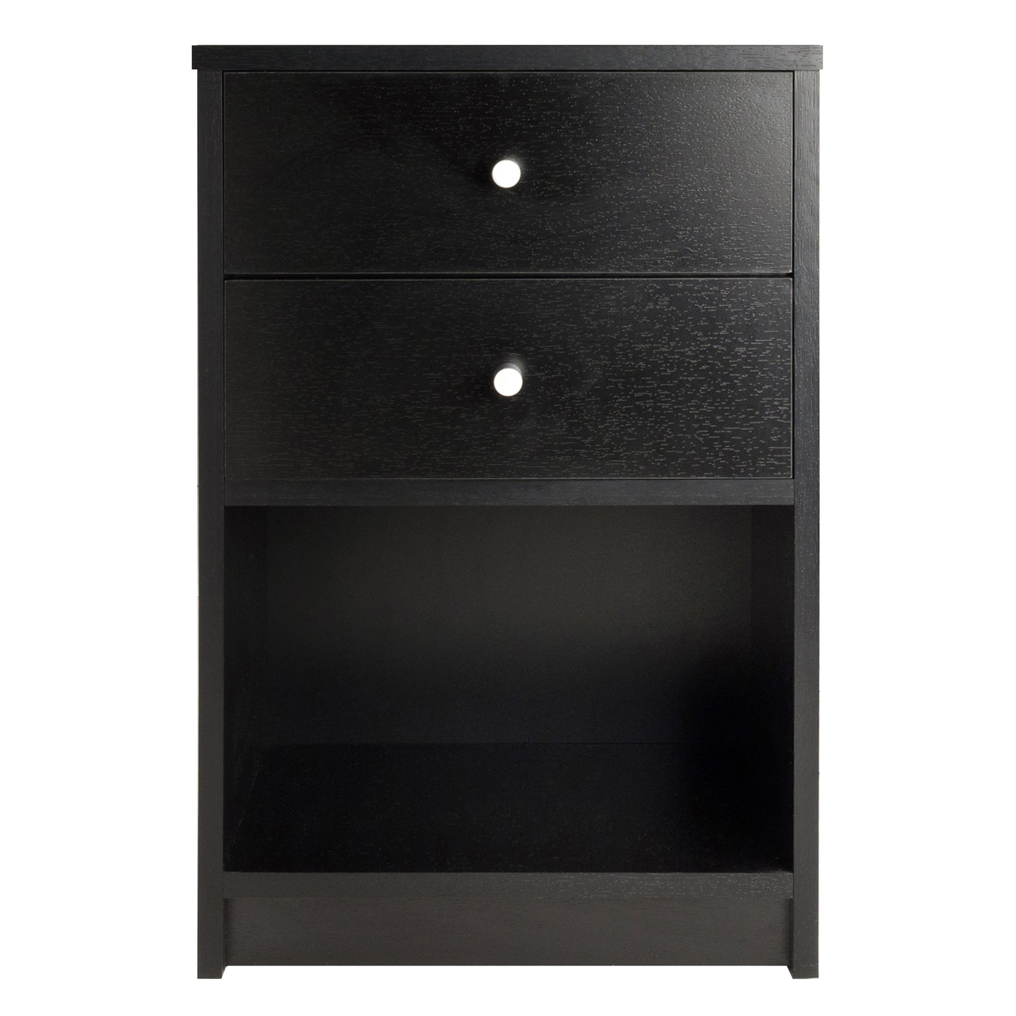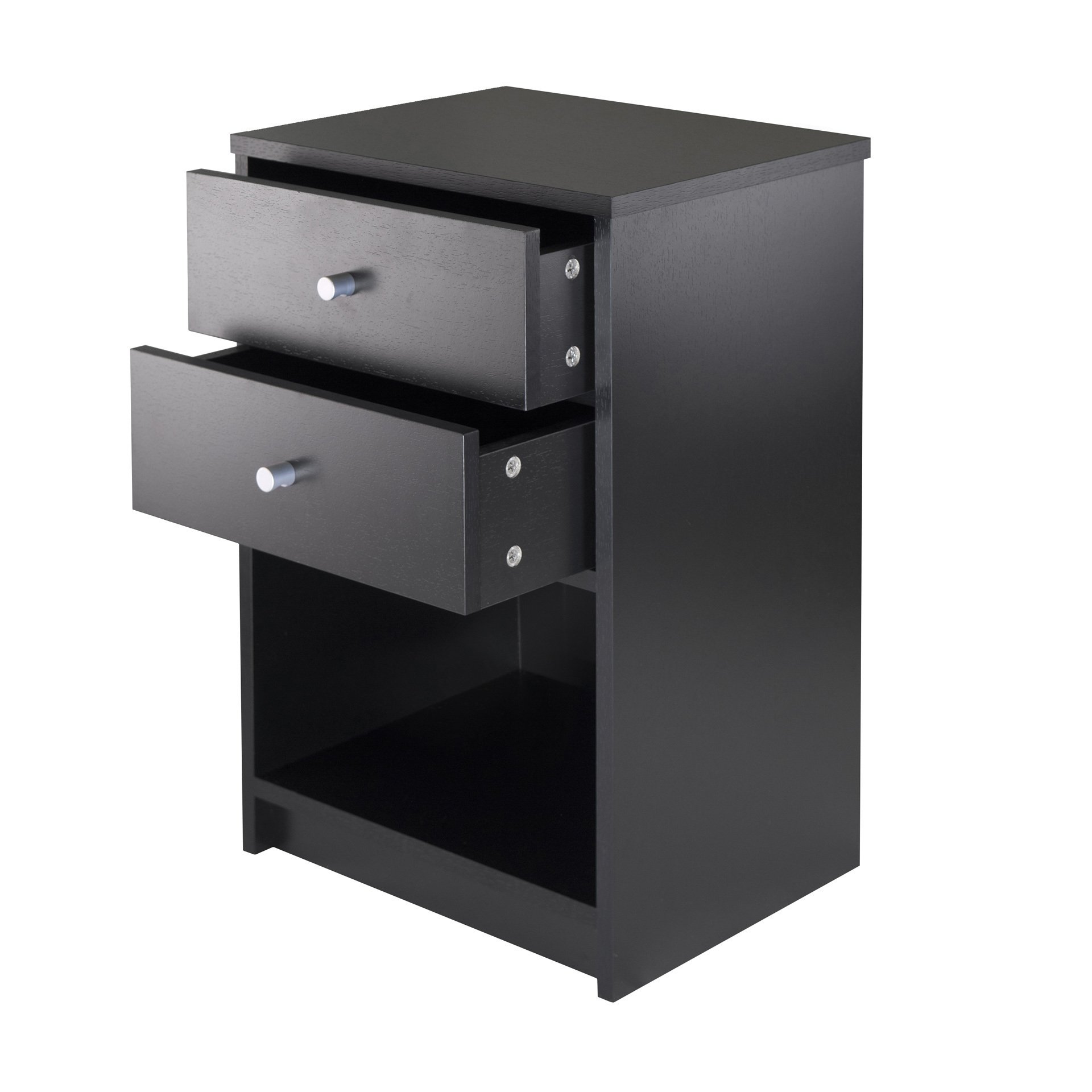 Perfect table for your night time essentials with two drawers plus an open cabinet for storage. Black with metal accent. Overall table size 15.75"W x 12.6"D x 23.7"H. Top dimension is 15.75"W x 11.8"D and inside drawer is 12.75"W x 9.6"D x 3.75"H. Open cabinet is 14.25"W x 11"D x 9.3"H. Black veneer on composite wood. Assembly required.Overall table size 15.75"W x 12.6"D x 23.7"H. Top dimension is 15.75"W x 11.8"D.Inside drawer is 12.75"W x 9.6"D x 3.75"H. Open cabinet is 14.25"W x 11"D x 9.3"H.Made in black veneer on composite wood. Assembly required.nullnullnull