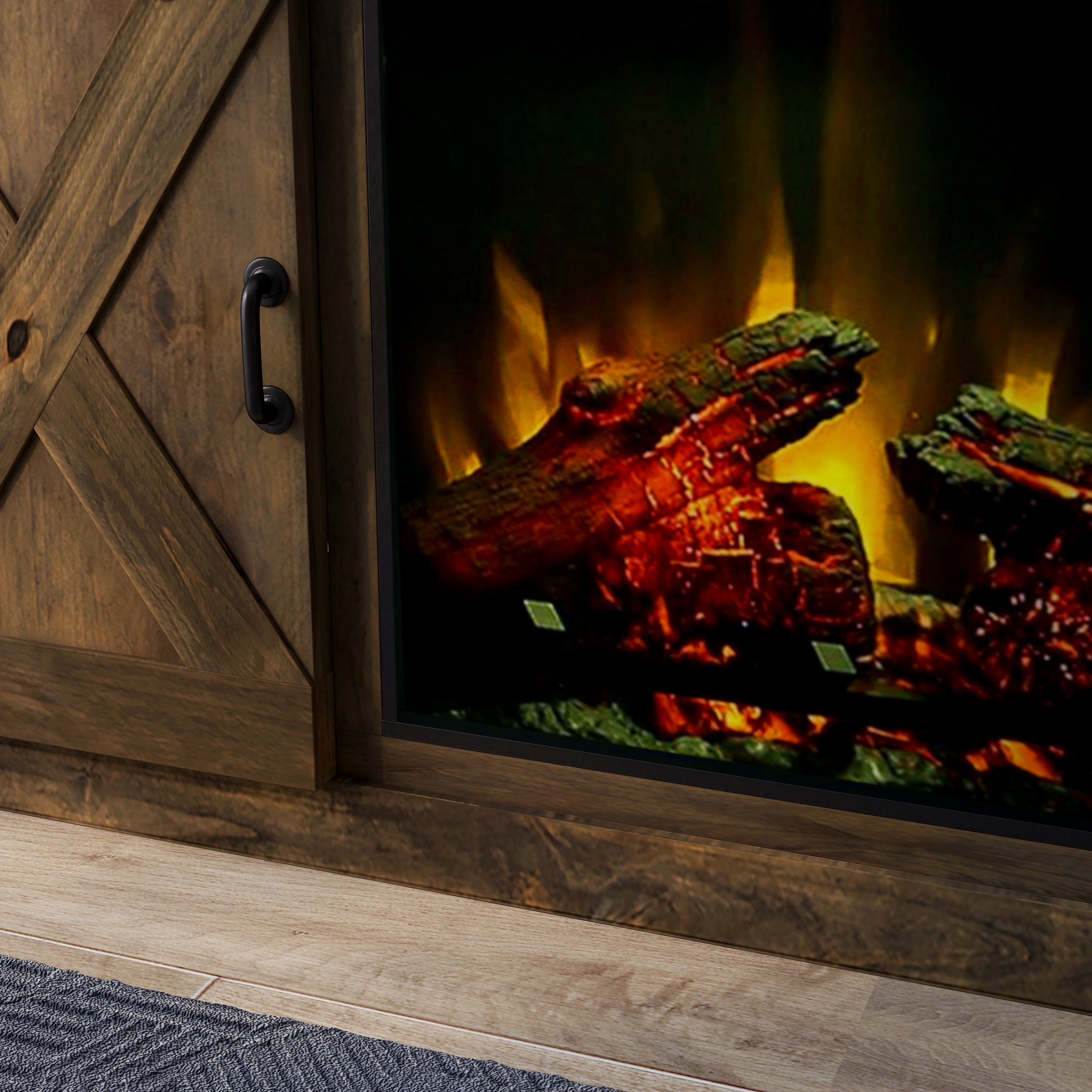 The Bridgevine Home Rustic Farmhouse 66 inch Electric Fireplace TV Stand Console is steeped in age-old tradition and style. Expertly crafted from the finest sustainable Knotty Alder Solids and Veneers, this Fireplace TV Stand is finished in a rich Barnwood and accented with matte black, forged iron hardware. Featuring rustic, X-style farmhouse sliding barn doors and 5 shelves, this TV Stand with Fireplace will accommodate TVs up to 75 inches and provide ample storage for media and gaming consoles and home décor favorites. Cable management openings on the back panel will keep your cords and wires concealed. The 28 inch electric fireplace insert includes a remote control and multiple settings allow for heat up to 400 square feet. Four (included) screws make securing the fireplace insert to the console quick and simple.