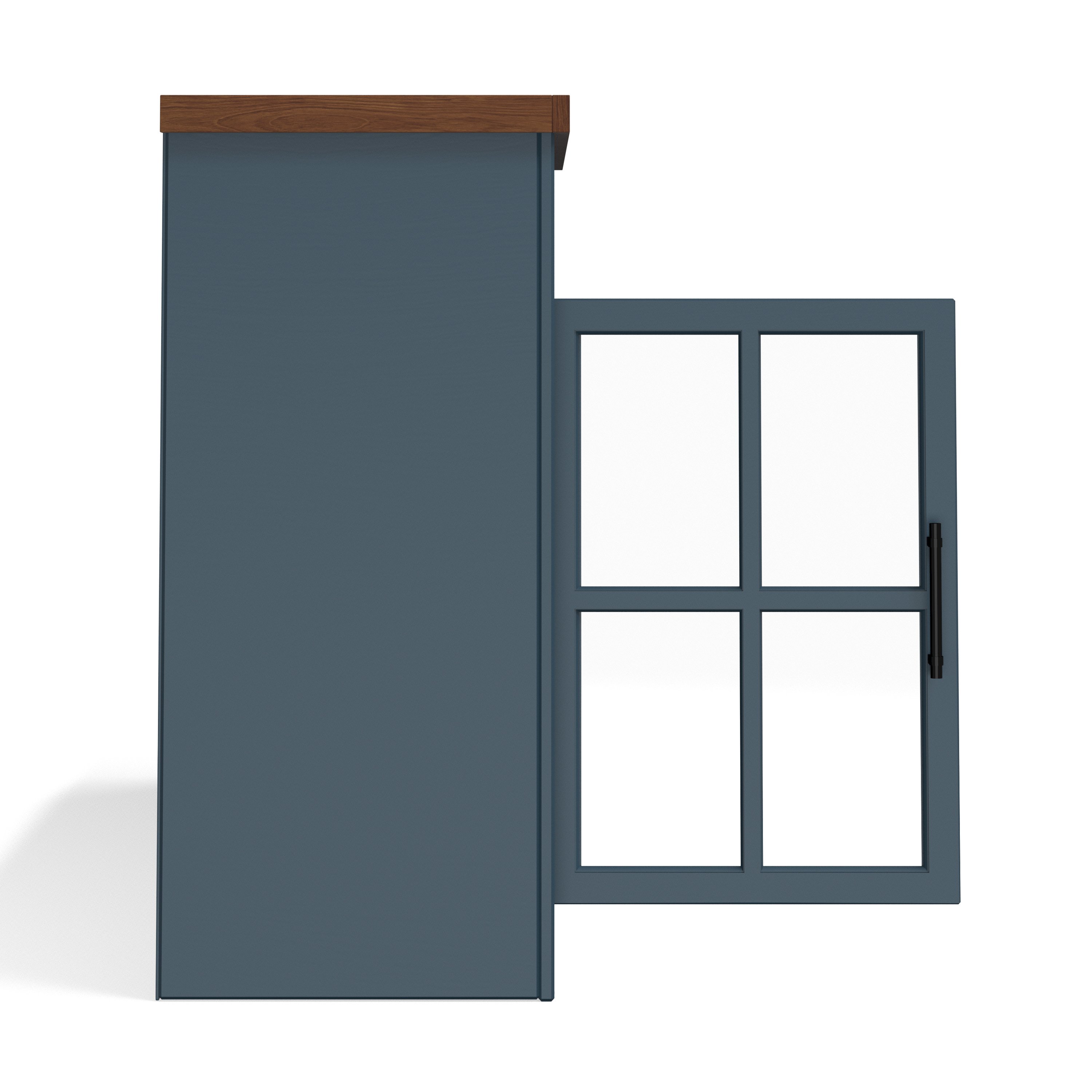 The Nantucket 74 inch Fireplace TV Stand Console from Bridgevine Home delivers a flawless combination of modern farmhouse style and country simplicity. Beautifully crafted from Poplar Solids, Okoume Veneers and Knotty Alder, this Fireplace Entertainment Center features a two-tone Blue Denim and Whiskey finish and oil-rubbed Bronze hardware. Ideal for TVs up to 85 inches, this Fireplace TV Stand includes two glass windowpane doors, three shelves and cable management on the back panel for media and gaming console storage. The 28 inch electric fireplace insert includes a remote control and multiple settings allow for heat up to 400 square feet. Four (included) screws make securing the fireplace insert to the console quick and simple.