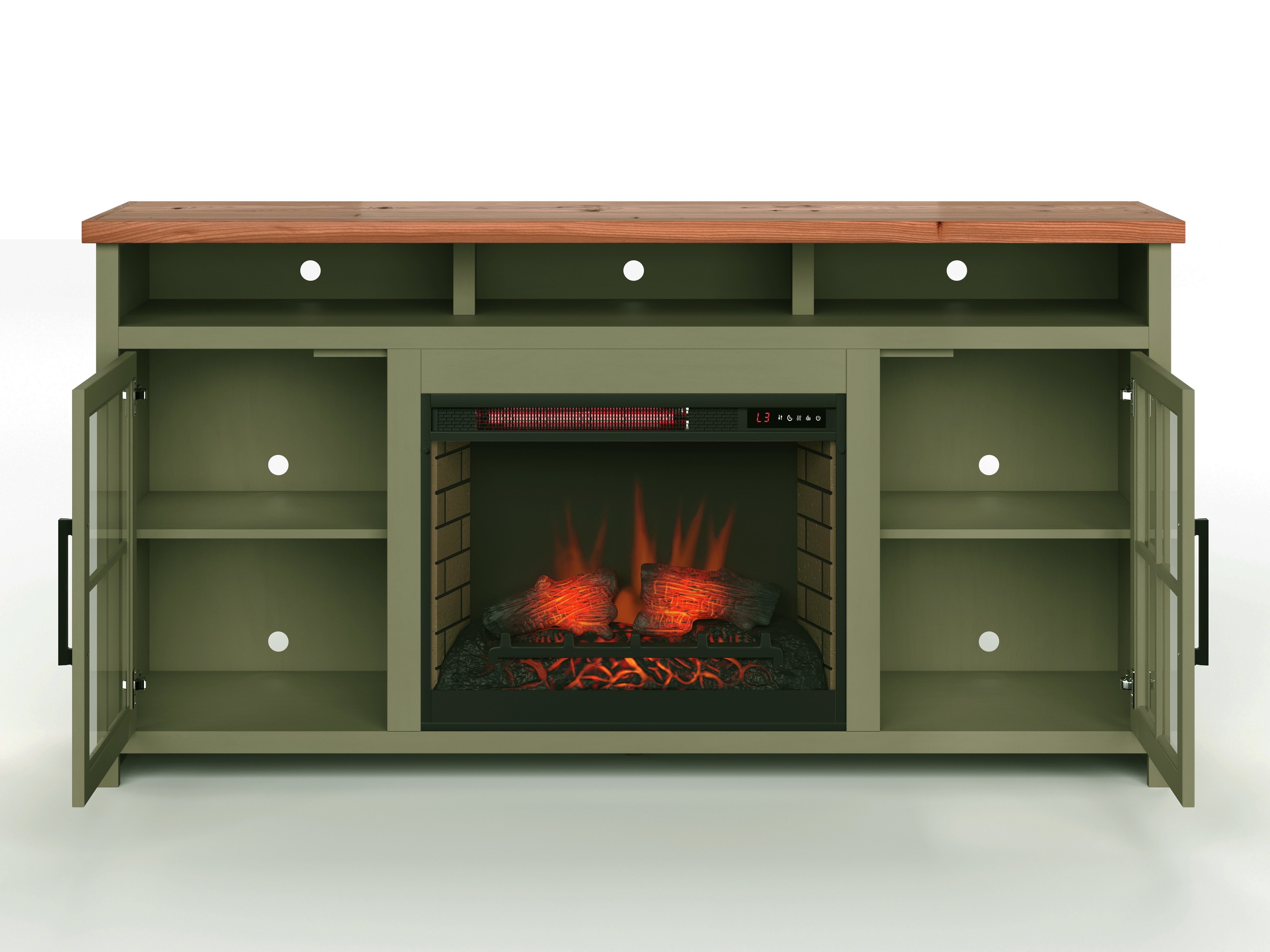 The Vineyard 74 inch Fireplace TV Stand Console from Bridgevine Home delivers a flawless combination of modern farmhouse style and country simplicity. Beautifully crafted from Poplar Solids, Okoume Veneers and Knotty Alder, this Fireplace Entertainment Center features a two-tone Sage Green and Fruitwood finish and oil-rubbed Bronze hardware. Ideal for TVs up to 85 inches, this Fireplace TV Stand includes two glass windowpane doors, three shelves and cable management on the back panel for media and gaming console storage. The 28 inch electric fireplace insert includes a remote control and multiple settings allow for heat up to 400 square feet. Four (included) screws make securing the fireplace insert to the console quick and simple.