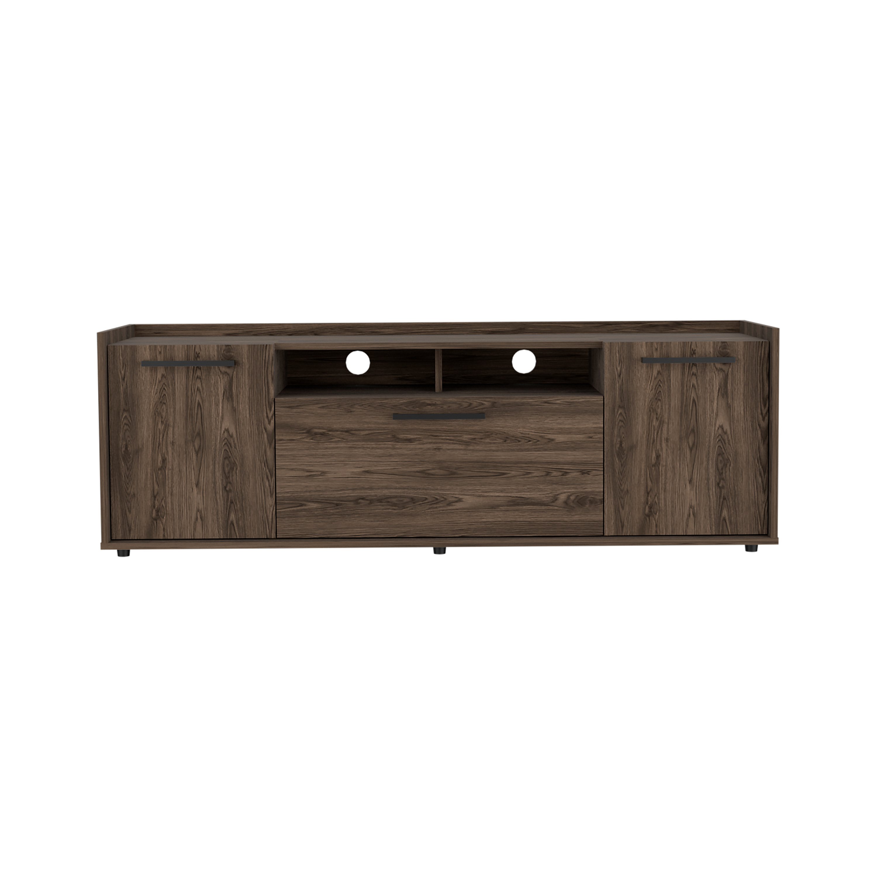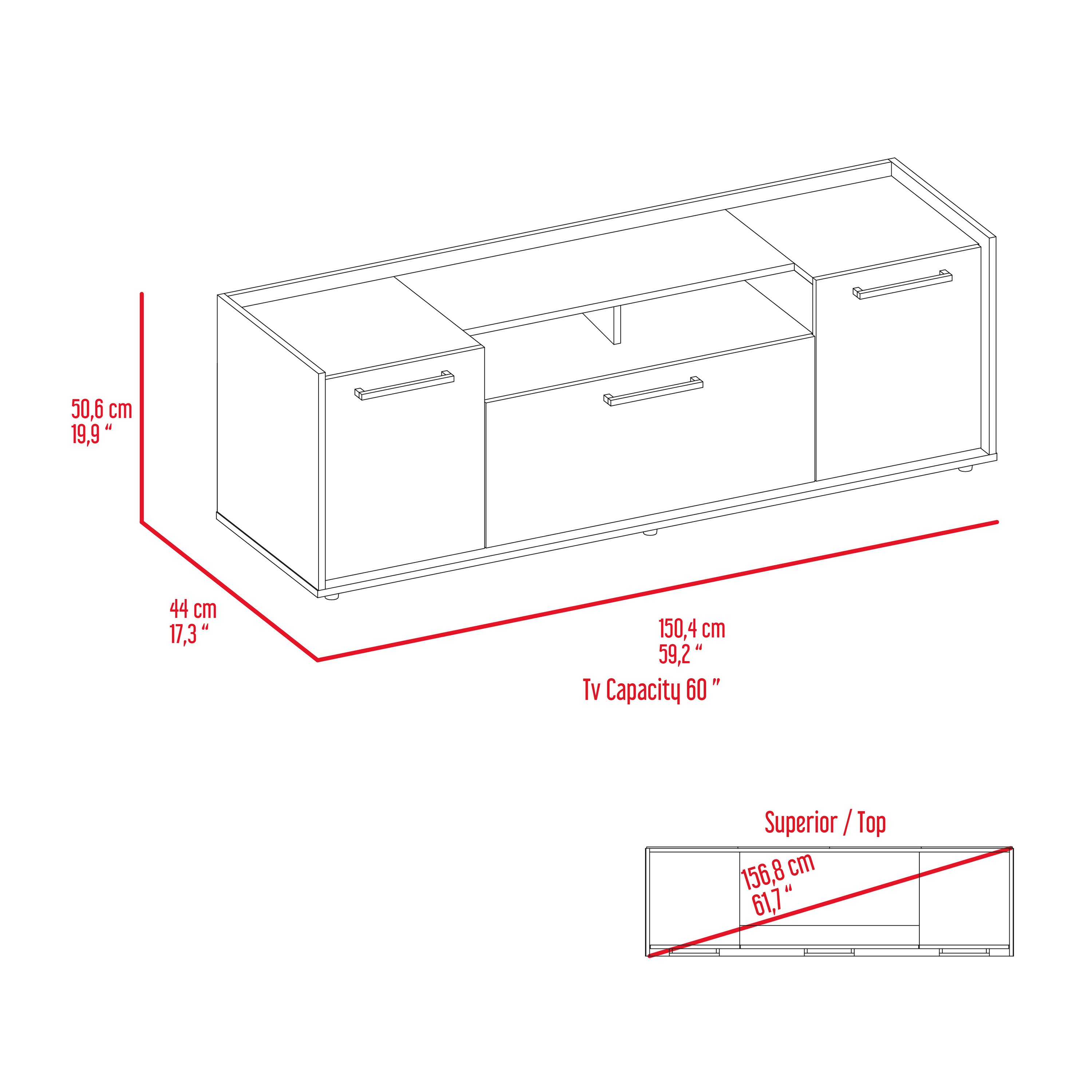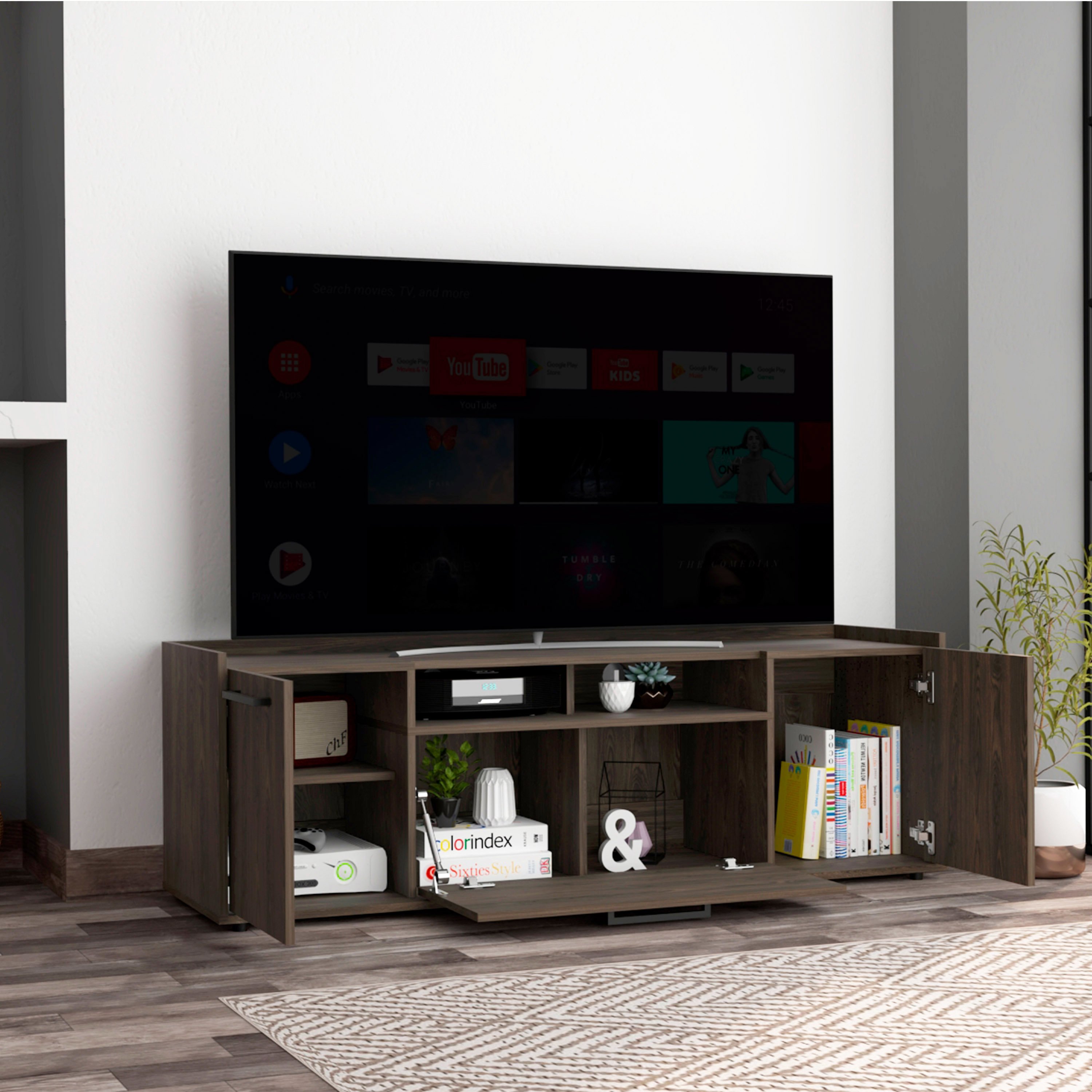 Romance CopyA new piece of furniture perfect for your living room or bedroom, with ideal size, it works perfectly anywhere. You can use it to organize your decorations, and the large surface is designed for your TV. It has a two-door cabinet with back holes for your cables and a wide shelf.Product DetailsSet includesOne (1) TV standDimensions19.9 inches high x 59.2 inches wide x 17.3 inches deepFinish ColorDark WalnutMaterialsManufactured woodNumber of shelves7Number of doors3