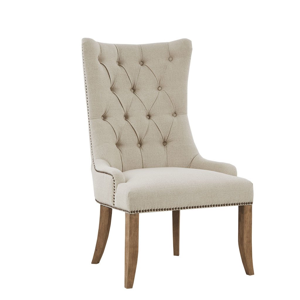 DescriptionAdd a stunning farmhouse update to your home decor Madison Park Lucas accent chair. This accent chair features a high, button-tufted back and antique bronze nailhead details that creates an elegant look. The natural fabric upholstery is complemented by the wheat finish on the solid wood legs to complete the farmhouse aesthetic. With its charm and sophistication, this accent chair elevates the style of your home decor.Product DetailsSee below1 Accent Chair:26.75''W x 29.5''D x 44.5''HSeat Dimension:22.25"W x 21"D x 19.75"HSeat Cushion Thickness:6.25"Arms Size:22.25'W x 20.75"HFront Leg Upper:1.97" x 1.97"Front Leg Bottom:1.18" x 1.18"Leg Height:13.39"Back Leg Upper:1.97" x 1.57"Back Leg Bottom:1.18" x 1.18"Back Rest Size:24.25"W x 24.75"HMaximum Weight Capacity:300 lbsMaterialFrame Composition: Solid wood and plywoodLeg Material: Solid woodArm Material: Solid wood and plywood Fabric Composition: 70% polyester,30% acrylicCushion or Upholstery Fill Material: FoamWood Finish: WheatNailhead Color: Bronze nails