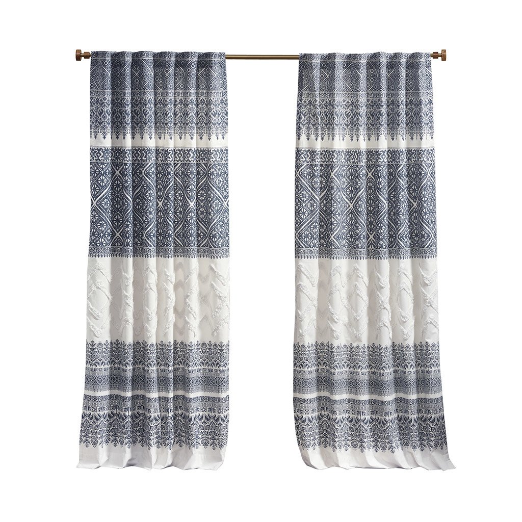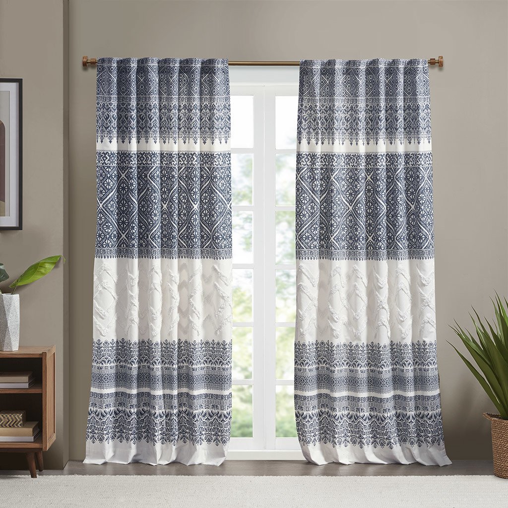 DescriptionThe INK+IVY Mila Cotton Printed Window Panel with Chenille Detail and Lining gives your home decor a chic boho touch. This natural white cotton window panel features an intricate global inspired print combined with rich tufted chenille detailing, for a textured artisanal look and feel. A lightweight white cotton lining on the reverse softly filters light, while providing better drapability and added privacy. In addtition, this 100% cotton curtain panel is also OEKO-TEX certified, meaning it does not contain any harmful substances or chemicals for the best in quality comfort and wellness. Each panel is finished with a rod pocket top for easy hanging, and back tabs for a more clean and tailored finish. This window panel is sold as a single and 2 window panels must be purchased to cover any standard size window. Complete the look with coordinating bedding sets, available and sold separately.Product Details50x84"1 Window Panel:50"W x 84"LMaterial100% cotton, printed and tufted with chenille, with cotton lining on the back. Finished with rod pockets and back tabs; fits up to 1.25 inches diameter rod.