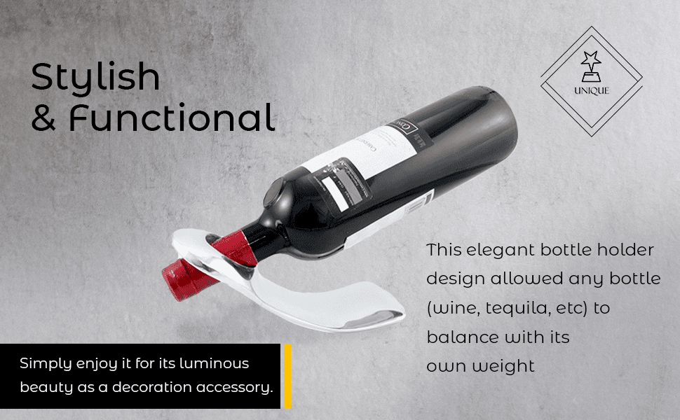MULTI-PURPOSE AND FUNCTIONAL. This elegant bottle holder design allowed any bottle (wine; tequila; etc) to balance with its own weight. Simply enjoy it for its luminous beauty as a decoration accessory.