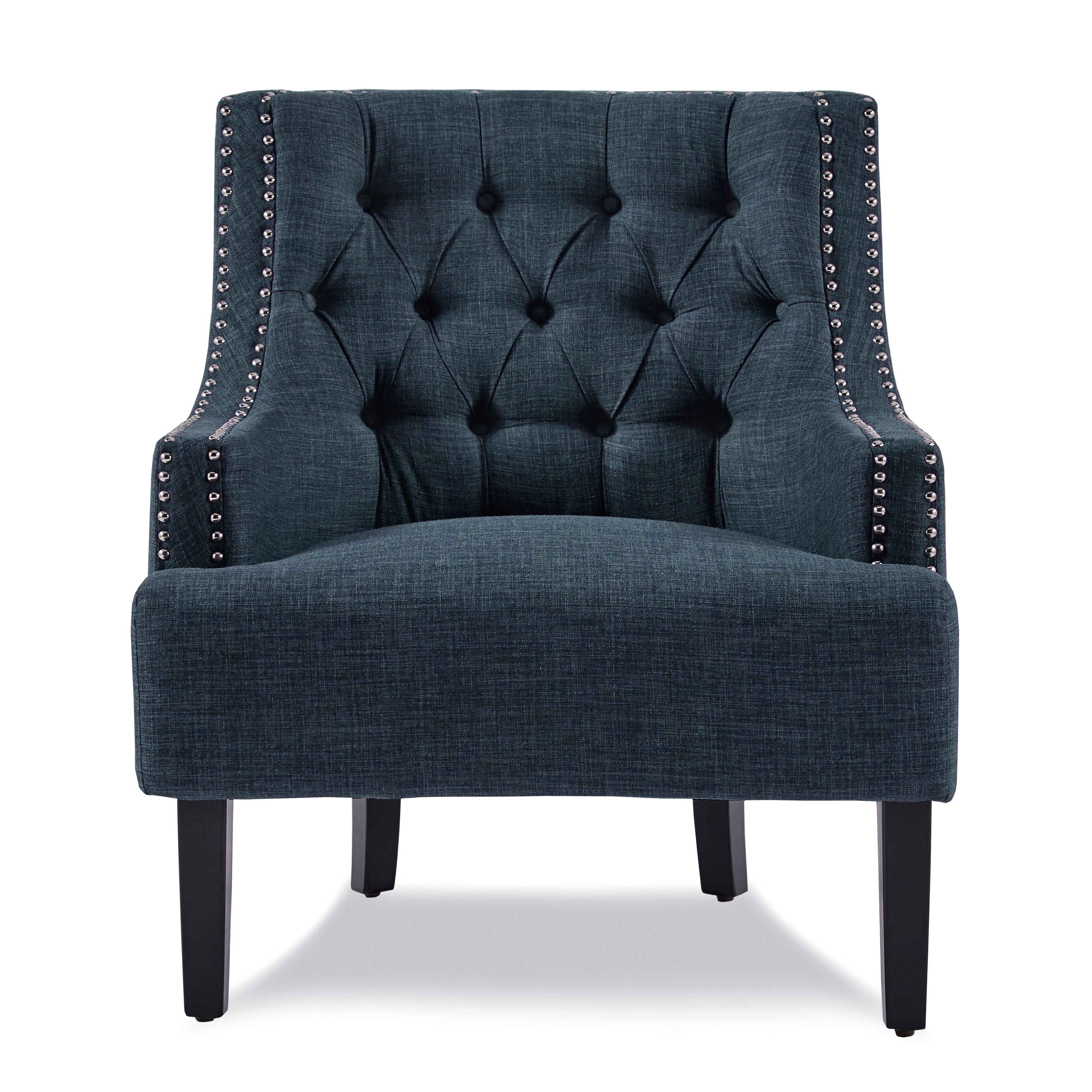 Description & DimensionsHigh polish nailhead accents and defines the profile of the Charisma Collection. This modern traditional indigo fabric-covered accent chair provides a stylish, yet functional addition to your home. The chair is offered in 3 additional distinct colors: Teal, taupe and chocolate.PRODUCT DIMENSIONS: Overall Dimension: 28" x 30" x 34"HSeat Width: 22.5"Seat Depth: 22.5"Seat Height: 18"Arm height: 21.5"Listing Includes: One Accent Chair Only.Simple Assembly Require.
