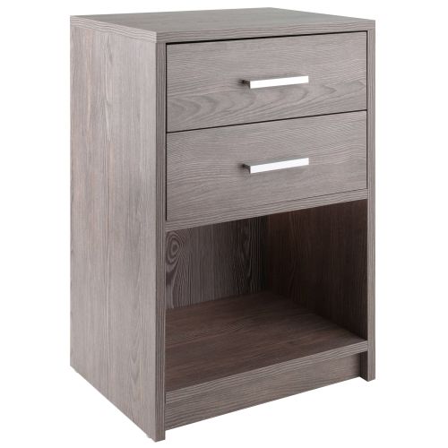 The Winsome Wood Molina 2-Drawer Accent Table features the clean lines of contemporary styling and a mellow ash gray finish. With two roomy drawers and an open shelf; the table offers ample storage. Place it next to your seating in the living room or den to keep remotes and electronic devices within easy reach. Or use it in the bedroom with a table lamp for reading; keeping books and magazine neatly tucked away. Constructed of sturdy composite wood; the unit also makes an ideal addition to a home office where it can serve as a printer stand with paper storage on the lower open shelf and office accessories in the drawers. The wood-grained ash gray finish is complemented by the modern matte-silver plastic drawer pulls. For larger beds; sofas or rooms; try adding one accent table on each end to unify the space (each sold separately). Conveniently packed and shipped in 1 box that includes the hardware necessary for assembling. Replacement part request can be submitted directly to the manufacturer within 60 days from date of purchase.
