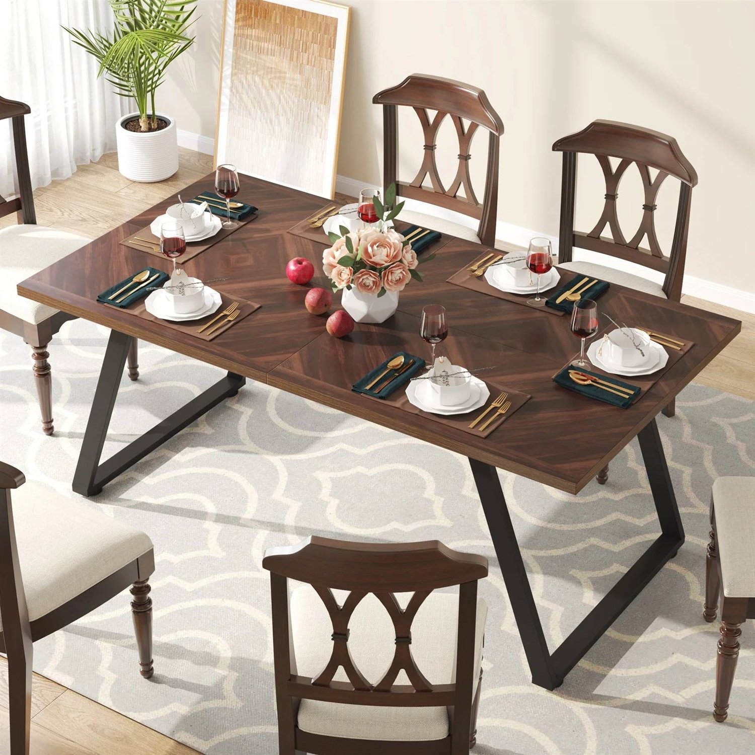 This Modern Farmhouse 63-inch Rectangle Dining Table Brown Wood Top Black Metal Frame in vintage is perfect for pairing with traditional, modern farmhouse, or country cottage aesthetics. Features a 1.18'' high-quality MDF tabletop and stable 2.36'' x 0.79'' metal steel legs structure, making it anti-scratch, stain-resistant, and water-resistant. The safe water-based paint polished surface gives it natural and smooth lines. (Size:31.5"D x 62.99" W x 28.74" H), A table full of character and plenty of room for family and friends. The compact tabletop can easily accommodate 4-6 people comfortably, it is suitable for small family dinners. Or the Perfect piece for your backyard patio. The height of the dining table is 29.92”, allowing you to stretch your feet easily while eating without feeling cramped. This kitchen table is a decent size for 4-6 people. This rectangular dining table is a great option for small Apartments. It provides enough space for meals and drinks, and the table is also lightweight and easy to move around.