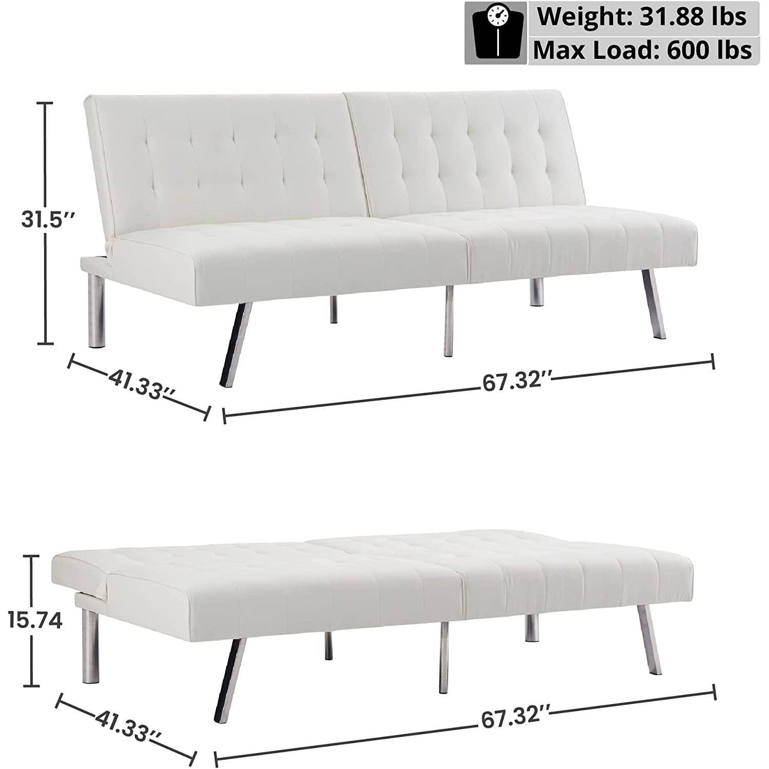 • VERSATILITY: Perfect for small spaces, this futon convertible sofa cama para sala is well suited for any apartment or studio. The Split Back design also provides the added comfort of adjusting different incline angles for either side of the White Futon Sofa. A robust frame, thick padded support with PU faux leather and stable legs made of Chrome make this Convertible Sofa Bed your ideal choice.