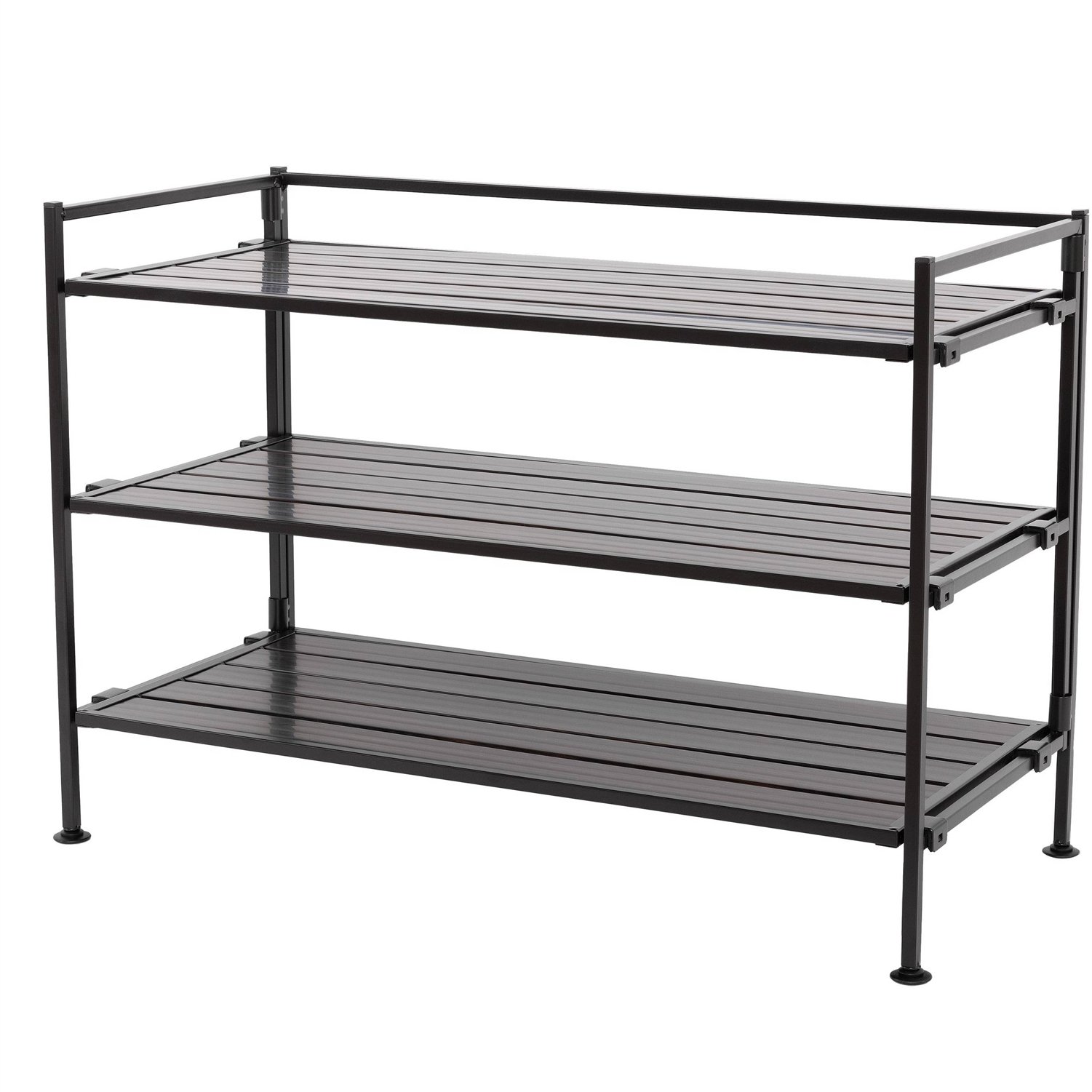 Organize your storage with 3-Tier Metal Espresso Brown Woodgrain Resin Foldable Stackable Shoe Rack. This versatile storage rack can organize up to 9 pairs of shoes on the shelves and 3 beneath the unit. Shelves are made with woodgrain resin slats in a natural style that fits into any home's decor. The frame is foldable and made of iron finished in an attractive espresso brown powder coat finish. Store up to 30 lbs evenly distributed across each shelf, or up to 90 lbs. per unit. It's perfect for storing foodstuffs in the kitchen or pantry, as well as tools and equipment in the garage. Assembly is easy-clip the shelves into the frame and screw in the leveling feet to complete. Stack multiple units (up to 3) for more storage in the same footprint with the included stacking pins. DO NOT STACK higher than 3 UNITS.