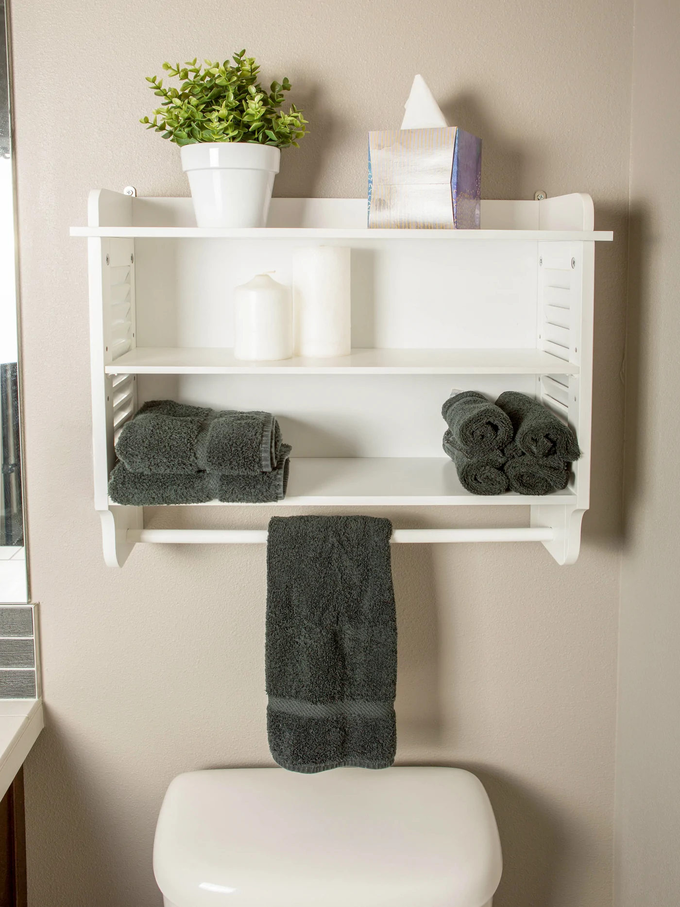 Bright white louvered shelf contains clutter and adds style appeal to your powder room! Two roomy shelves hold plenty of collectibles or bath essentials, while a built-in bar holds a towel right at ready reach. Weight 12 lbs. 23¾" x 8" x 20" high. MDF wood. Contents not included. Some Assembly Required. UPC: 849179002589