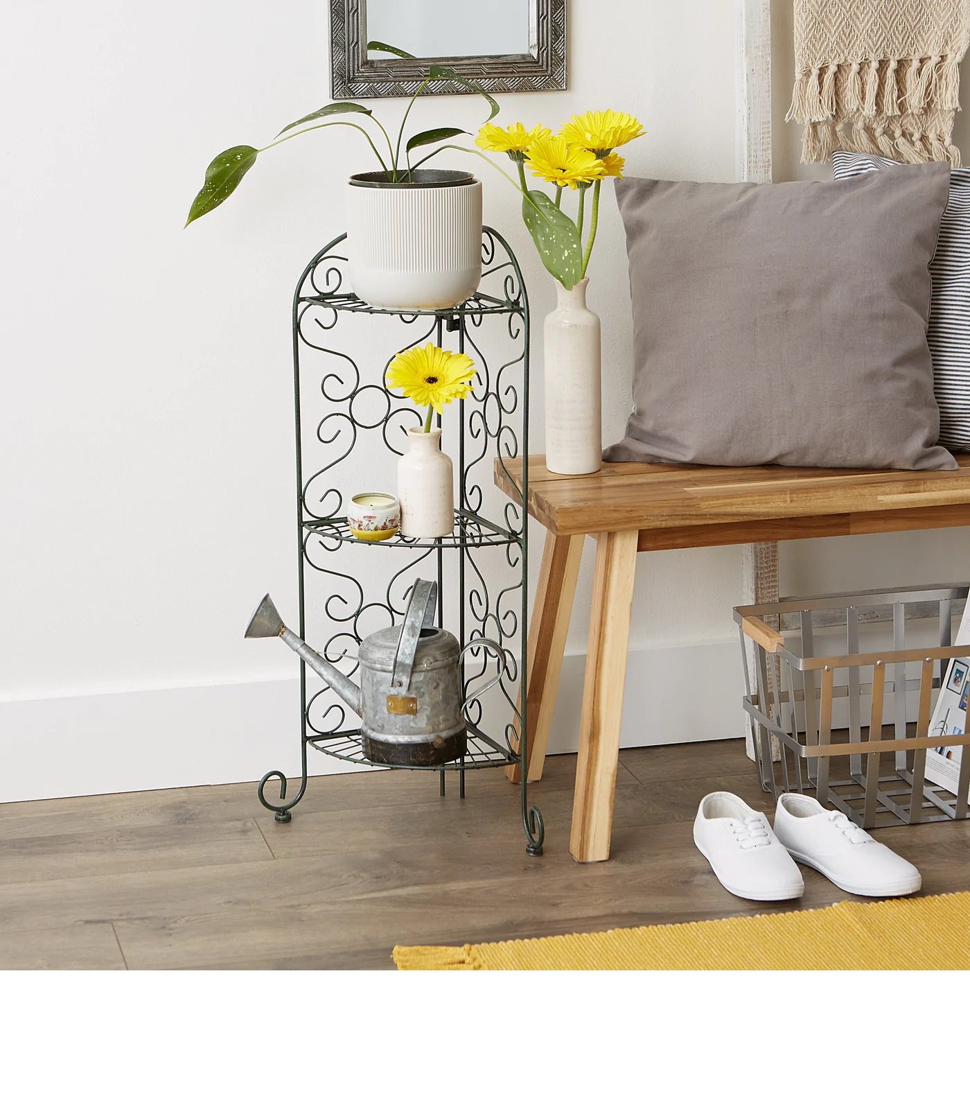 • Antiqued faux-verdigris plant stand is designed to fit into any corner; three shelves provide ample room for plants or display items.