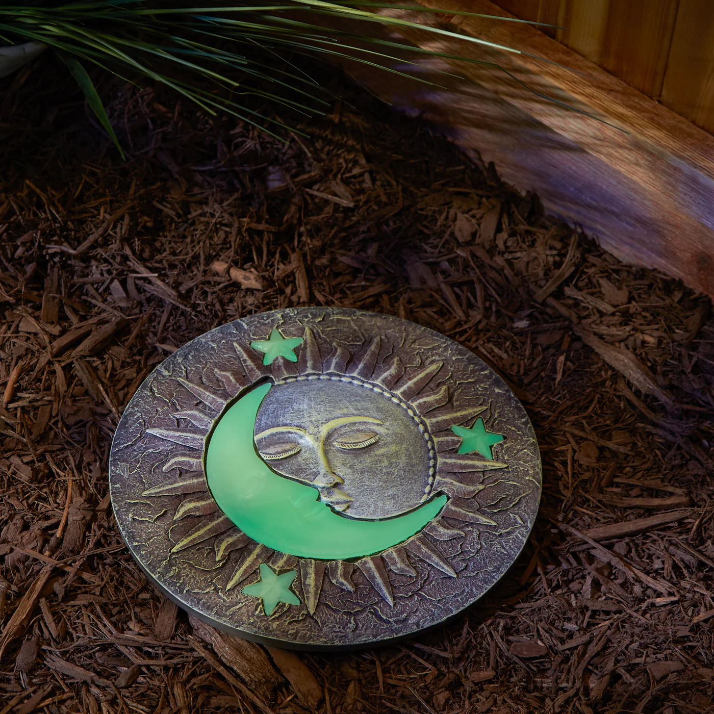 • The sun and moon, together in harmony, are both a welcome presence in your garden or yard. This cool polyresin stepping stone features the sun and a yellow crescent moon, along with a few yellow stars. The moon and stars will glow at night after soaking up some sunlight during the day.