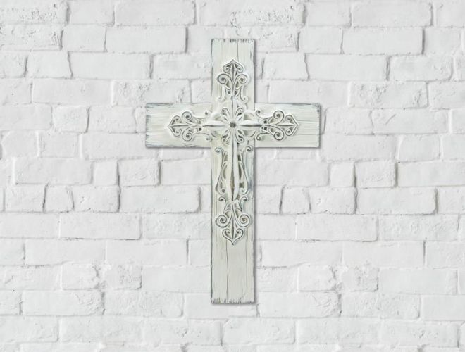 • This delightful white cross is a distinctive statement of faith. Raised intricate scrollwork adorns the center to create a country farmhouse appeal. Perfect accent piece for home or office. Hook on back for easy hanging.