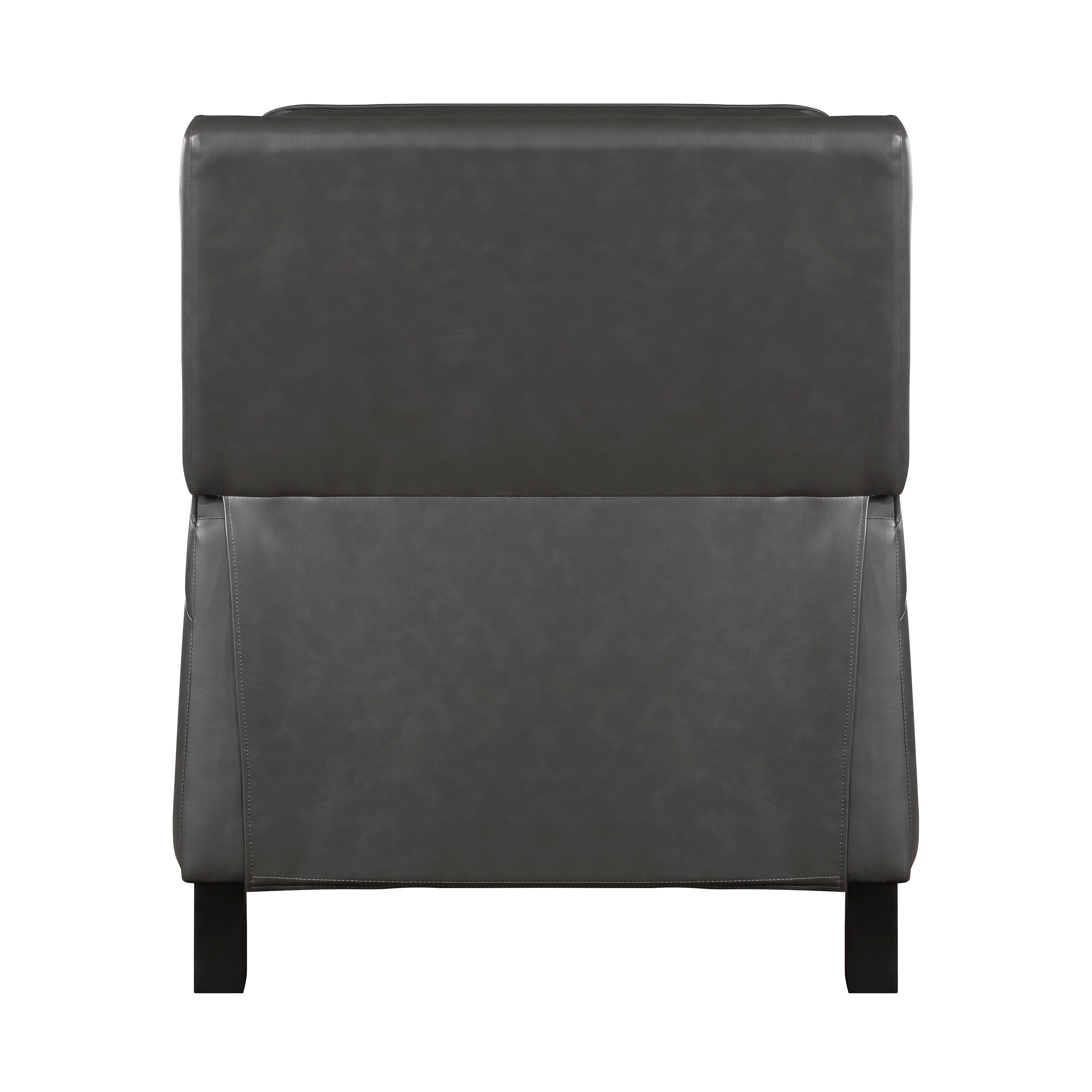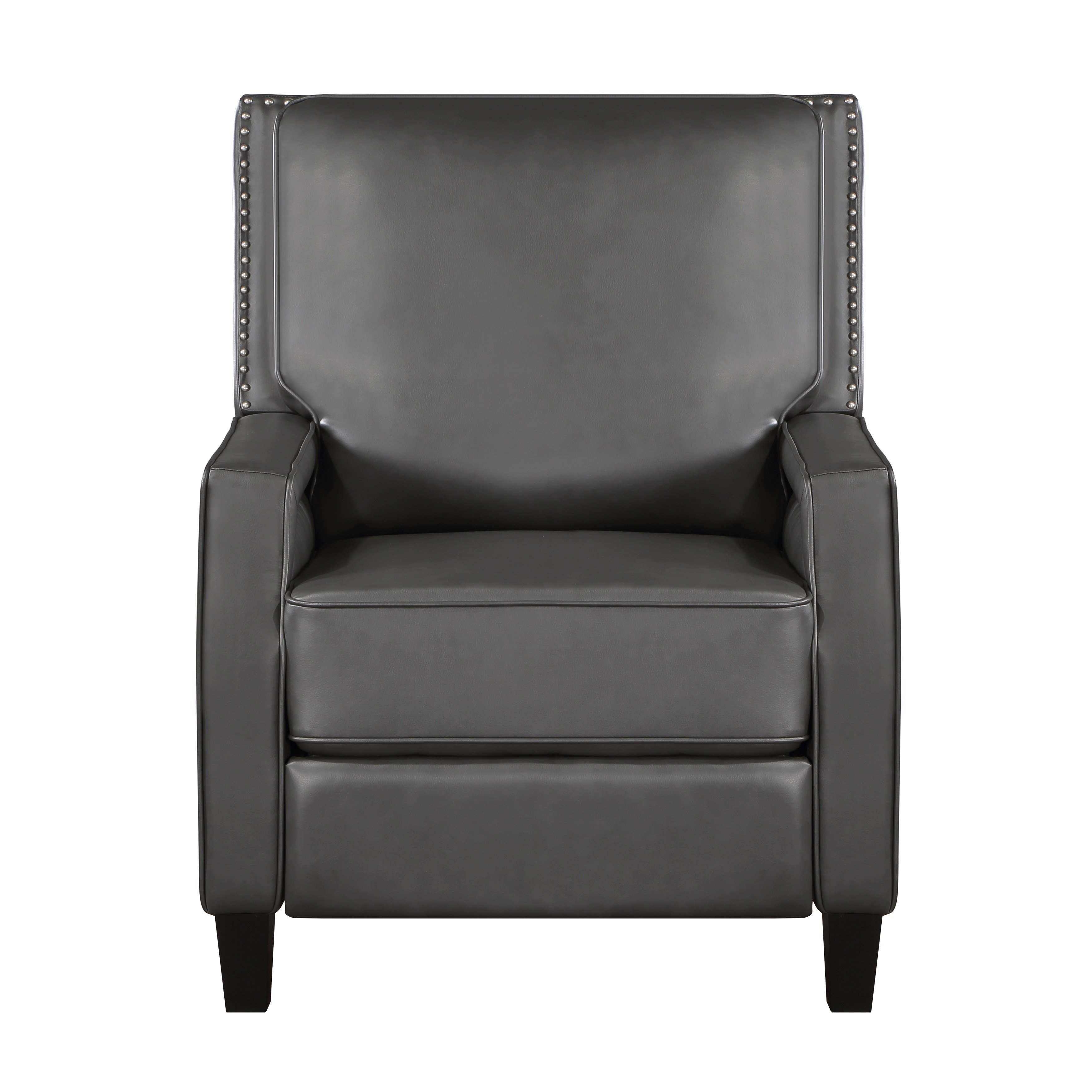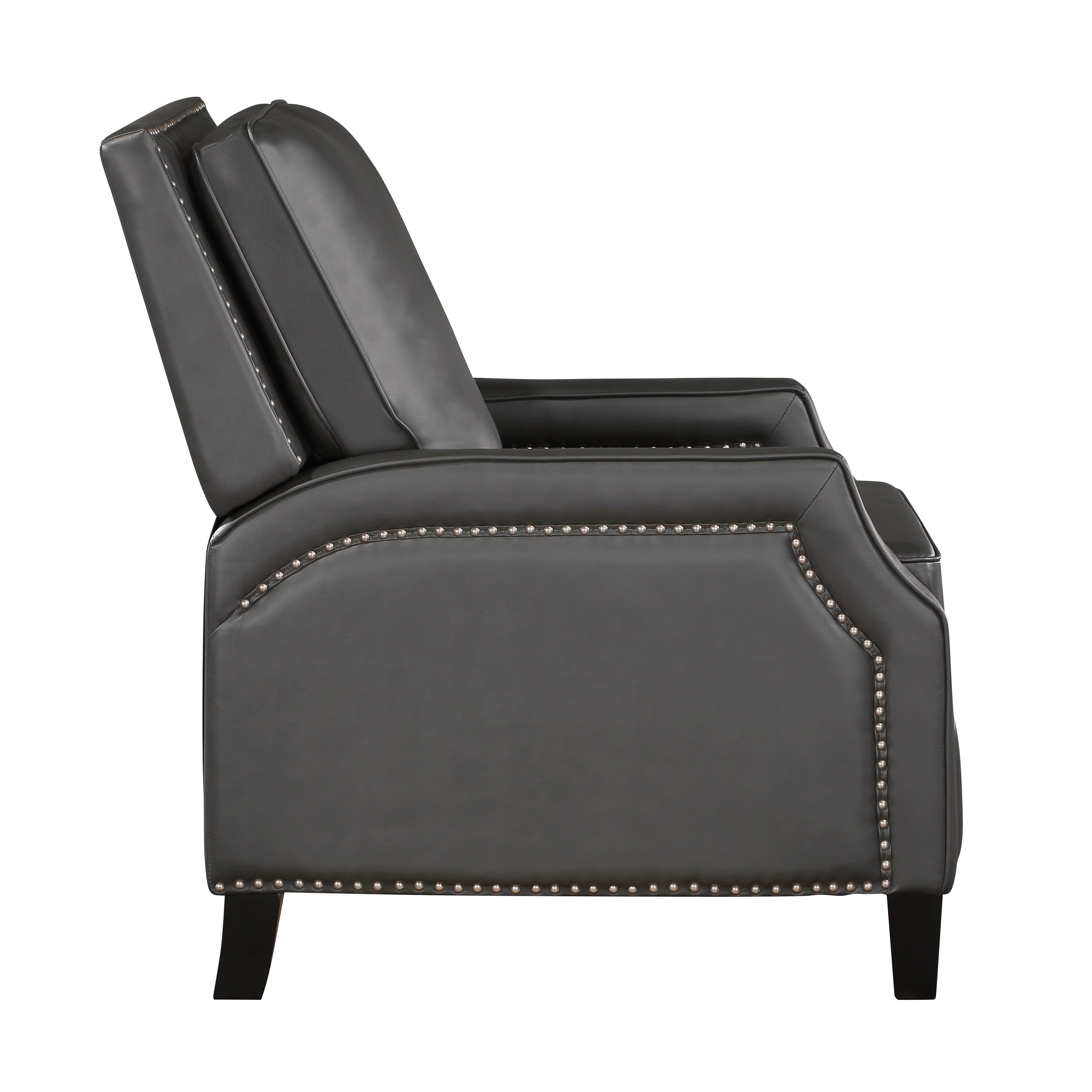 Description & DimensionsWith a reclining mechanism that is engaged with your push, settling into the Berenson Collection is done so with ease. The tailored profile of the push back reclining chair is covered in gray faux leather and features nail head trim, lending to its transitional style, creating the perfect complement to your homes décor.