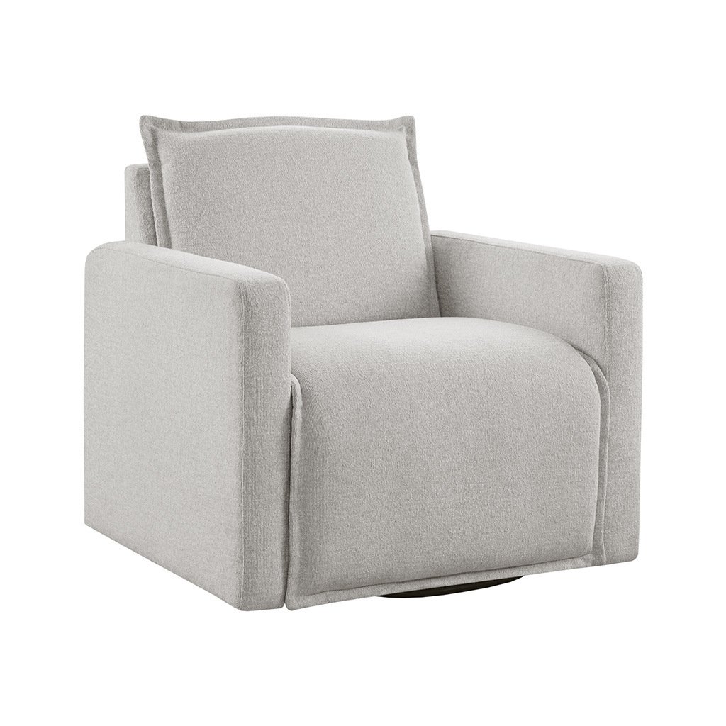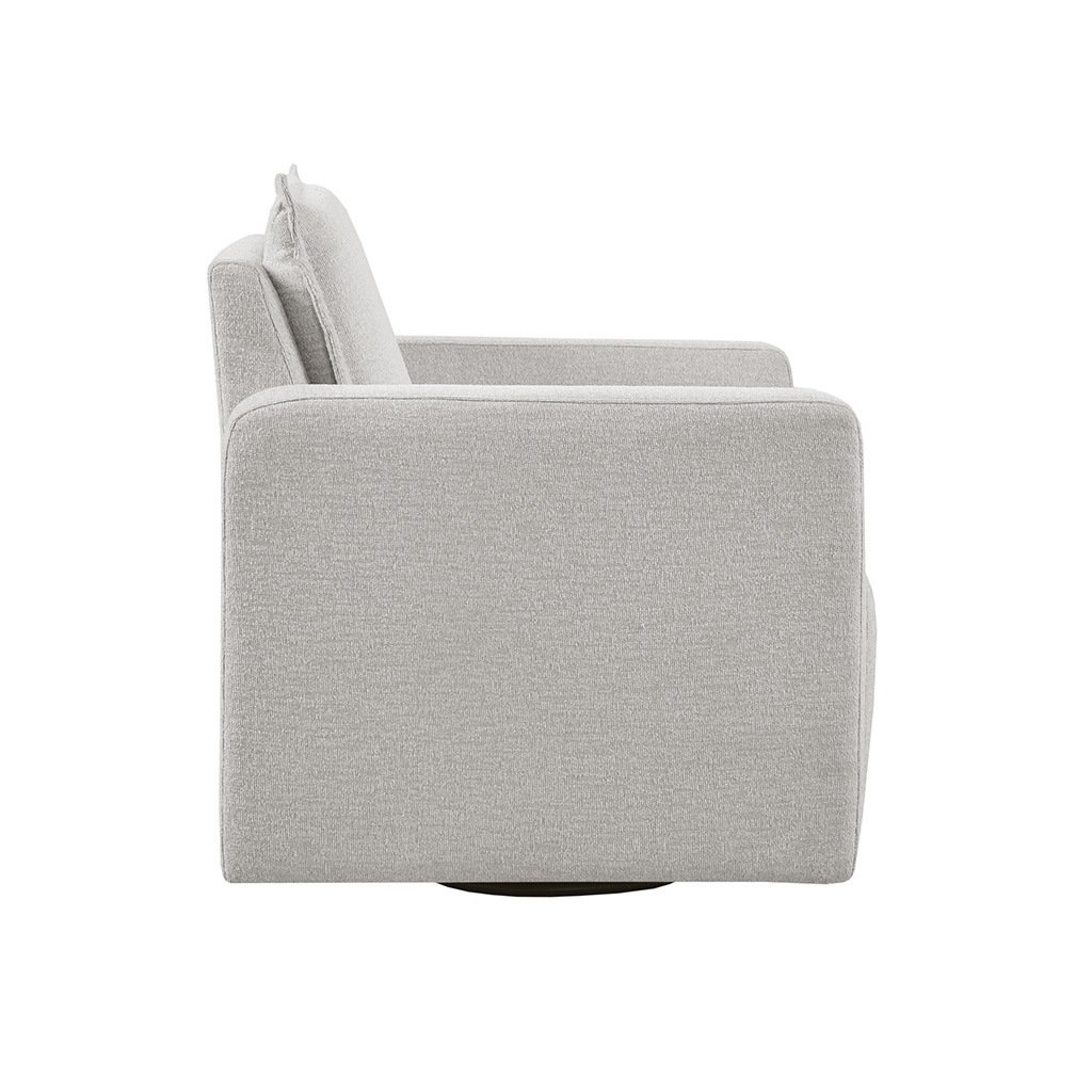 DESCRIPTIONKubrick Swivel Chair from Madison Park provides a relaxing and casual vibe with its flange details and deep seat making it a perfect lounge chair for living room, bedroom and nursery. Its soft back and seat cushions are stuffed with foam fill and supported by sinuous springs to prevent sagging over time. Partial assembly required, no tools needed.PRODUCT DETAILSSee below1 Swivel Chair: 33"W x 31.5"D x 33.5"HSeat Dimensions: 24.5"W x 21.25"D x 19"HArms Size: 25"W x 24"HBack Rest Size: 25.5"W x 14.5"HWeight Capacity: 300 lbsMATERIALFrame Composition: Soild wood and plywoodLeg Material: Metal baseArm Material: Soild wood and plywoodFabric Composition: 100% polyester, plain weaveCushion or Upholstery Fill Material: FoamMetal Finish: Black