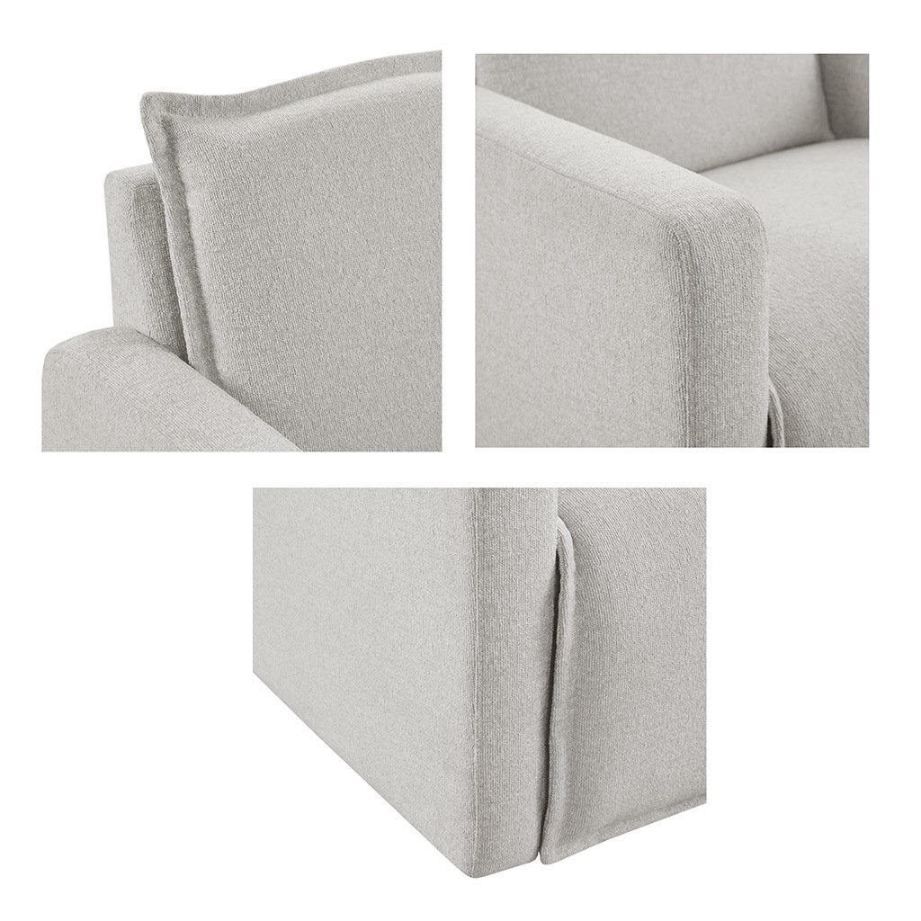 Fully upholstered swivel arm chair features a soft basket weave slub fabric