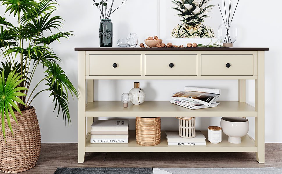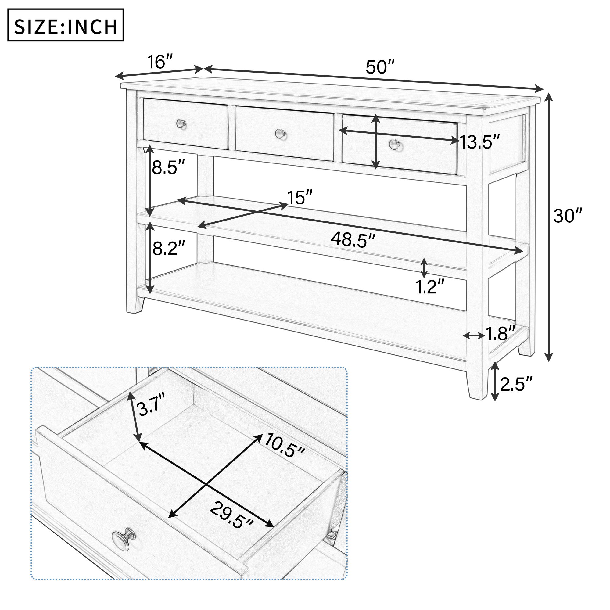 Mid-century StyleThis classic design console table with simple clean lines and circular handle in traditional shape brings mid-century atmosphere to your home. The open design is also fully aligned with the retro aesthetic and practical usage. The neat structure of this console table highlights high-end and dignified. The classic rectangular frame reflects rigorous and understated spirits. And this console table available in multiple colors. This style is a perfect fusion of retro and modern, and it can be a wonSufficient Load-bearing CapacityConsidering the needs of daily usage, the load-bearing capacity of the MDF board tabletop set up to 220 lbs to support decorative items or lamp. The load-bearing capacity of a single drawer is 17 lbs to accommodate files, books, or some sundries. And the load-bearing capacity of both two open style shelves is 66 lbs, in that case, you can put storage boxes or baskets on them.