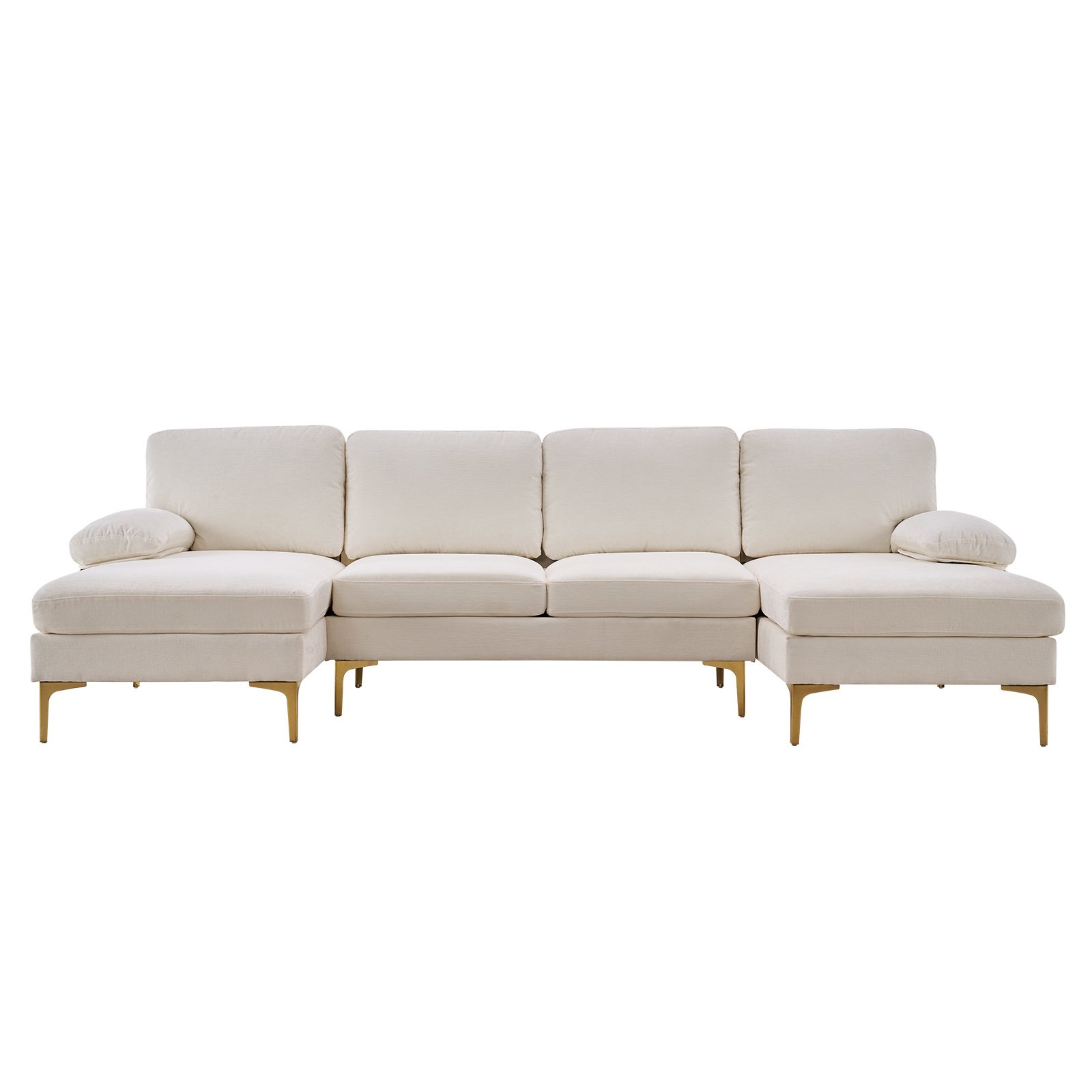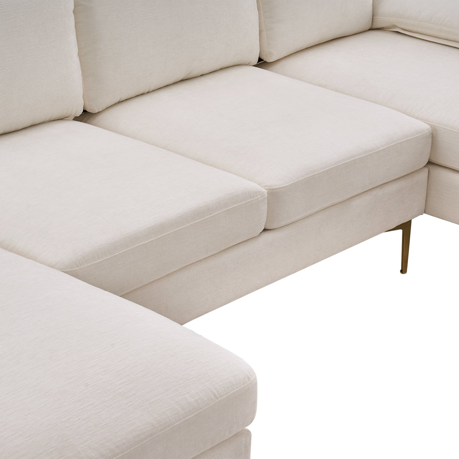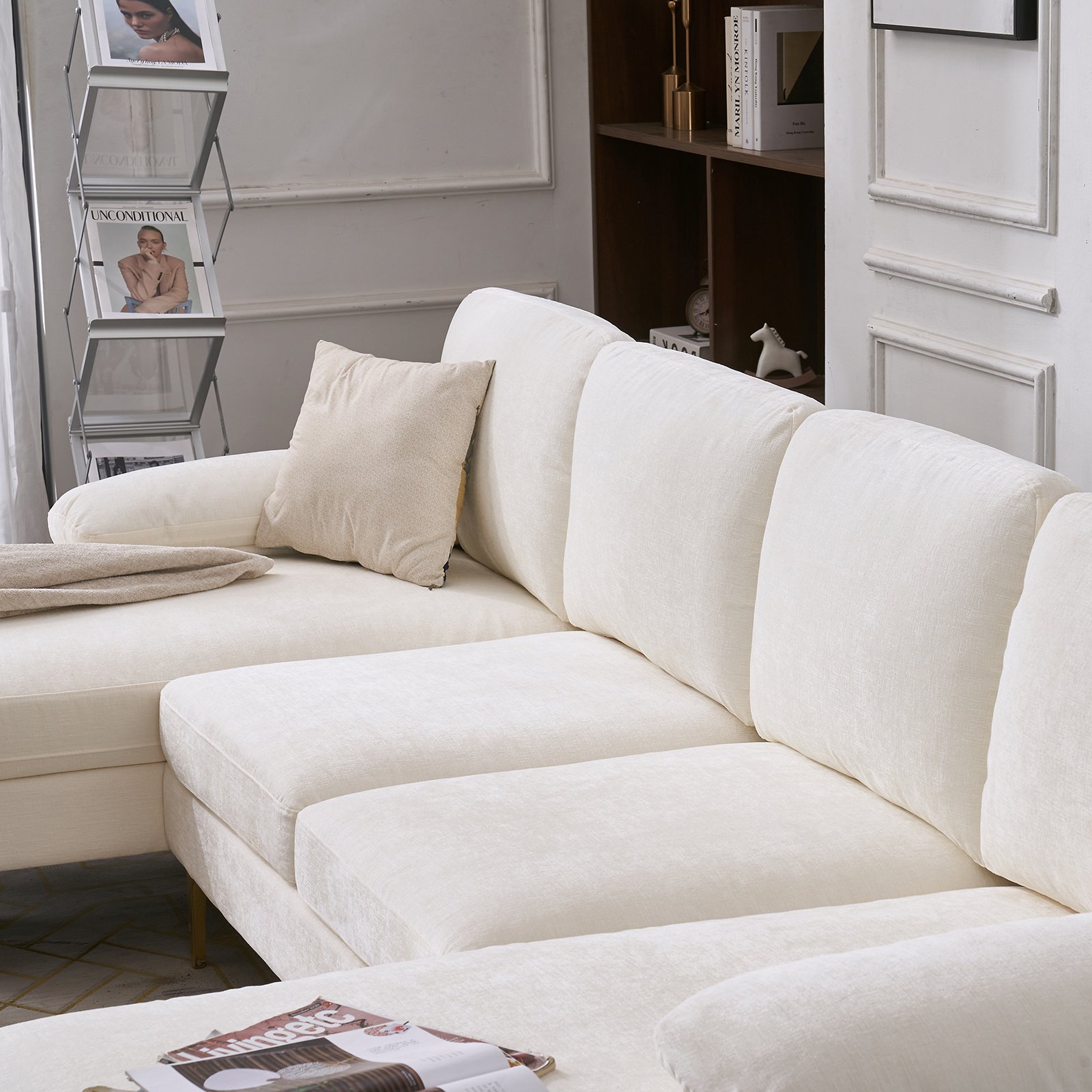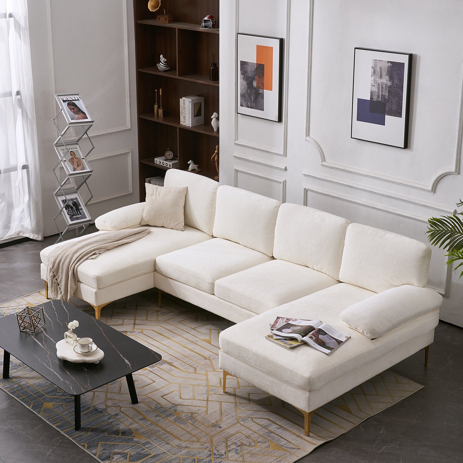 Introductions:Are you looking for a comfortable sofa for your family? If so,this U-Shaped 4-Seat Indoor Modular Sofa is highly recommended to you. This modern sofa can provide ample seating when guests are over, perfect for a small space and easy to lay down on for a nap. Small space reversible sectional sofa. The cushions you sit on are nice and firm. You'll never have to worry about sinking in. The more you sit in it the better. So what are you waiting for? Don't hesitate, it's worth buying!Features:1. The sofa is equipped with an extra-wide double chaise longue for maximum comfort and space2. High-end durable chenille fabric, loose back pillow can bring high-end look and comfort3. The sofa can comfortably support up to 6 people and offers a variety of fun and beautiful colors to match your home decor4. The matching gold-plated feet make the sofa look more atmospheric5. Some assembly is required (including installation instructions and corresponding accessories)Specifications:1. Material: Chenille, Feet Are Gold-Plated Feet2. Color: Creamy-White3. Specifications: (113.39 x 55.51 x 33.86)" / (288 x 141 x 86)Cm(L x W x H)4. Weight: 174.16Lbs / 79.00kgPackage Includes:1 x Indoor Modular SofaNotes:1. If there are wrinkles on the soft bag after receiving the package, please wait patiently for 24 hours or sit and knead a little more, the rebound effect will be better.2. The product is a three-pack, if you have not received or received less, please contact us in time, we will deal with your problems in time.