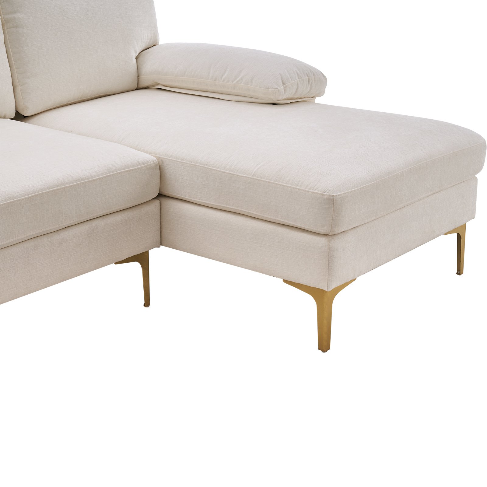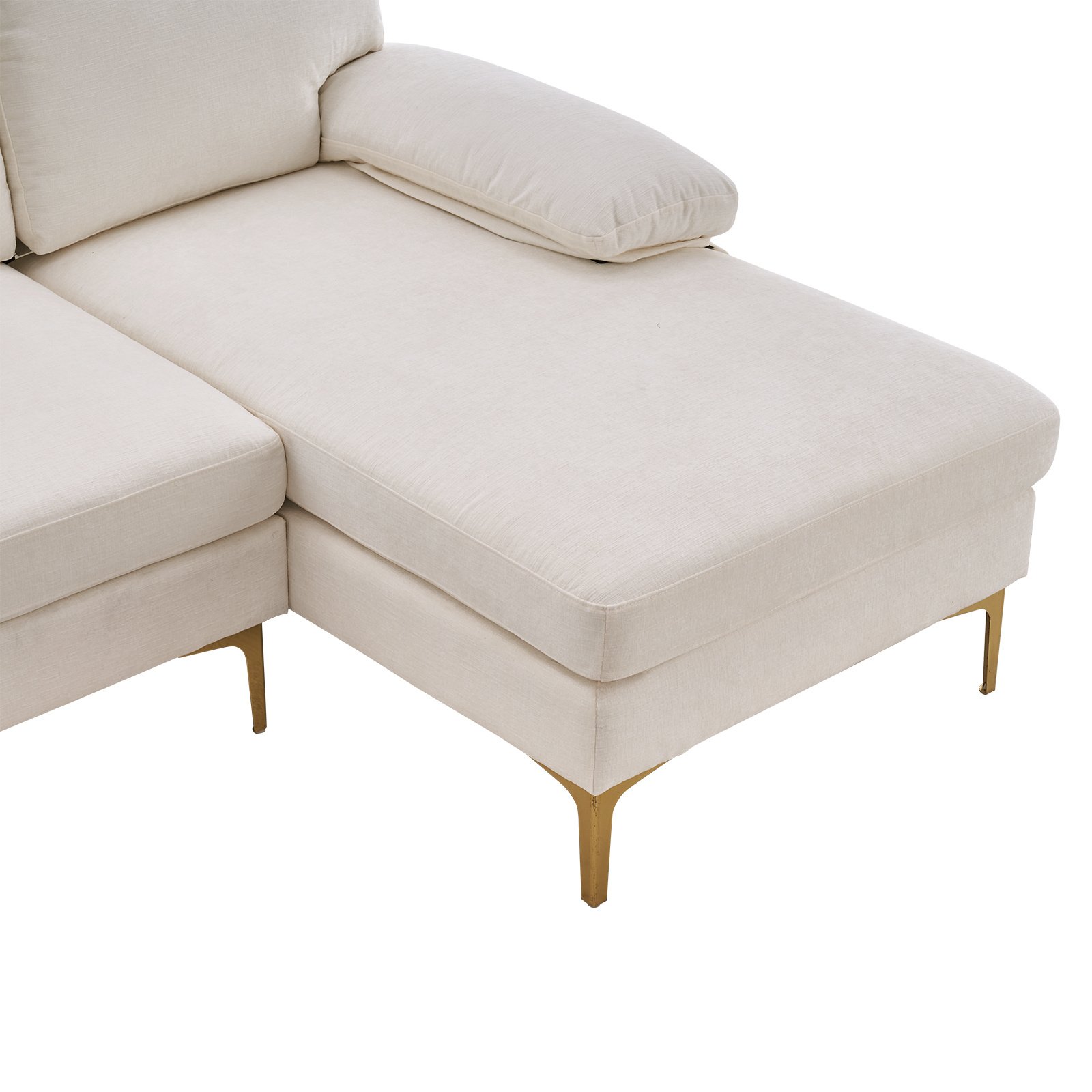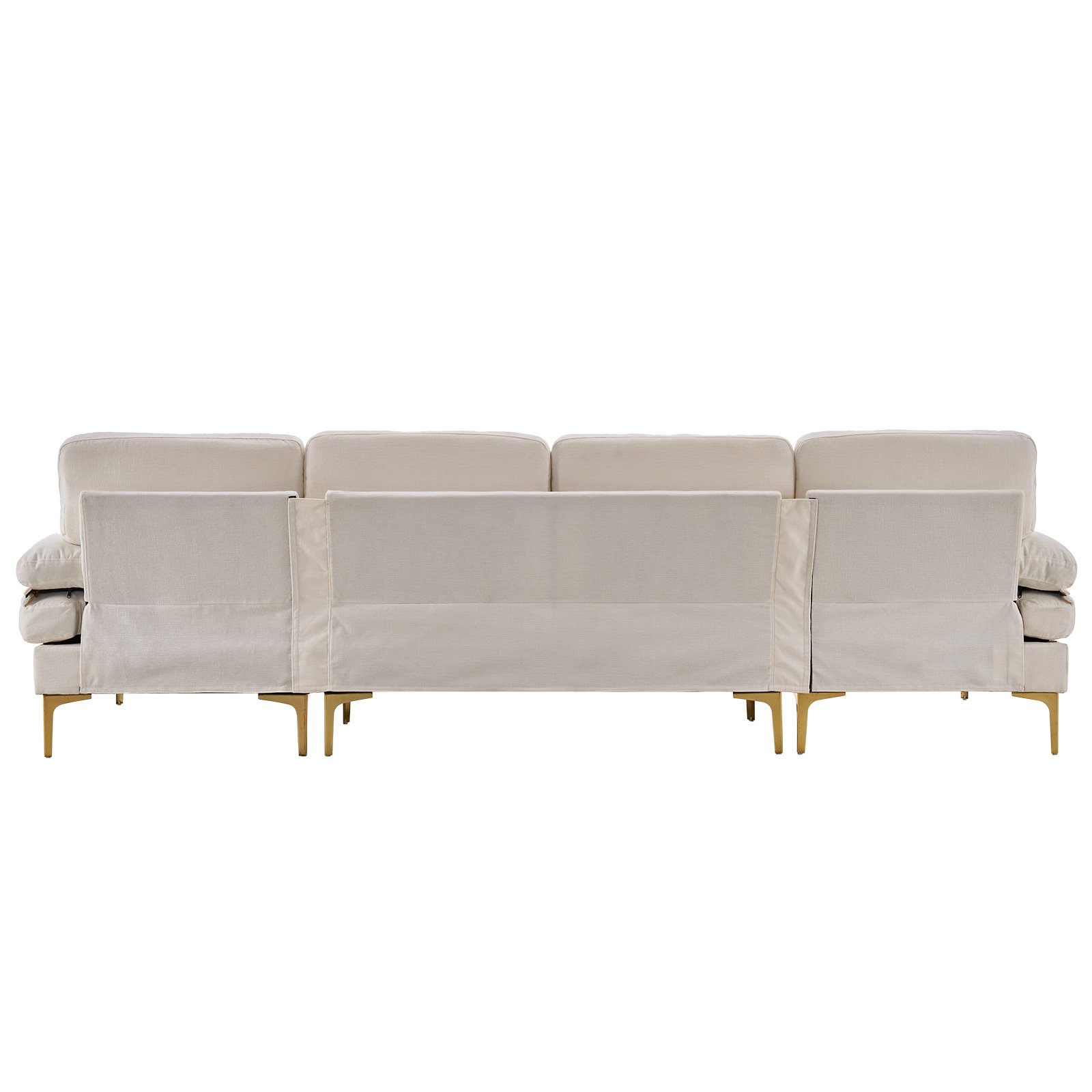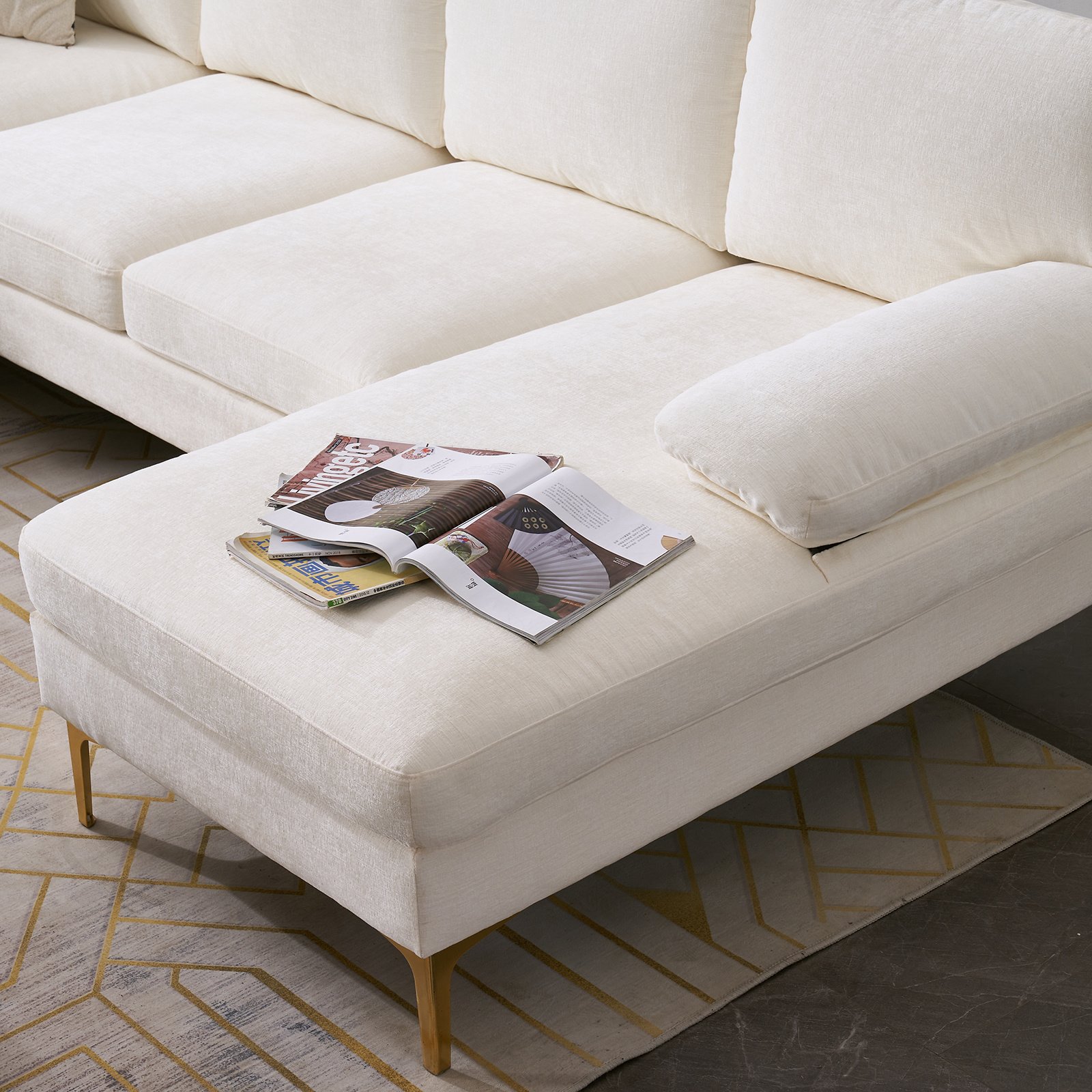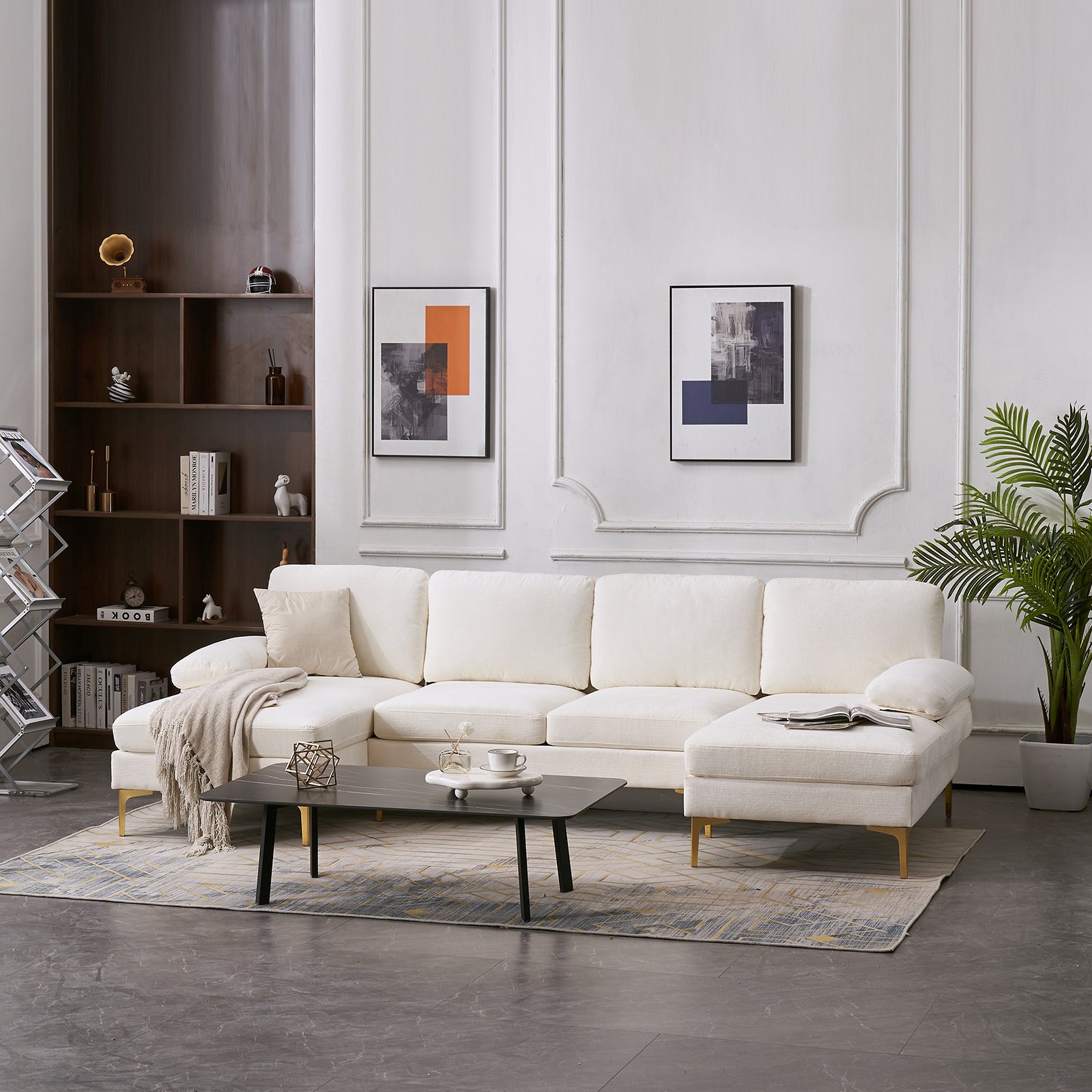 Introductions:Are you looking for a comfortable sofa for your family? If so,this U-Shaped 4-Seat Indoor Modular Sofa is highly recommended to you. This modern sofa can provide ample seating when guests are over, perfect for a small space and easy to lay down on for a nap. Small space reversible sectional sofa. The cushions you sit on are nice and firm. You'll never have to worry about sinking in. The more you sit in it the better. So what are you waiting for? Don't hesitate, it's worth buying!Features:1. The sofa is equipped with an extra-wide double chaise longue for maximum comfort and space2. High-end durable chenille fabric, loose back pillow can bring high-end look and comfort3. The sofa can comfortably support up to 6 people and offers a variety of fun and beautiful colors to match your home decor4. The matching gold-plated feet make the sofa look more atmospheric5. Some assembly is required (including installation instructions and corresponding accessories)Specifications:1. Material: Chenille, Feet Are Gold-Plated Feet2. Color: Creamy-White3. Specifications: (113.39 x 55.51 x 33.86)" / (288 x 141 x 86)Cm(L x W x H)4. Weight: 174.16Lbs / 79.00kgPackage Includes:1 x Indoor Modular SofaNotes:1. If there are wrinkles on the soft bag after receiving the package, please wait patiently for 24 hours or sit and knead a little more, the rebound effect will be better.2. The product is a three-pack, if you have not received or received less, please contact us in time, we will deal with your problems in time.