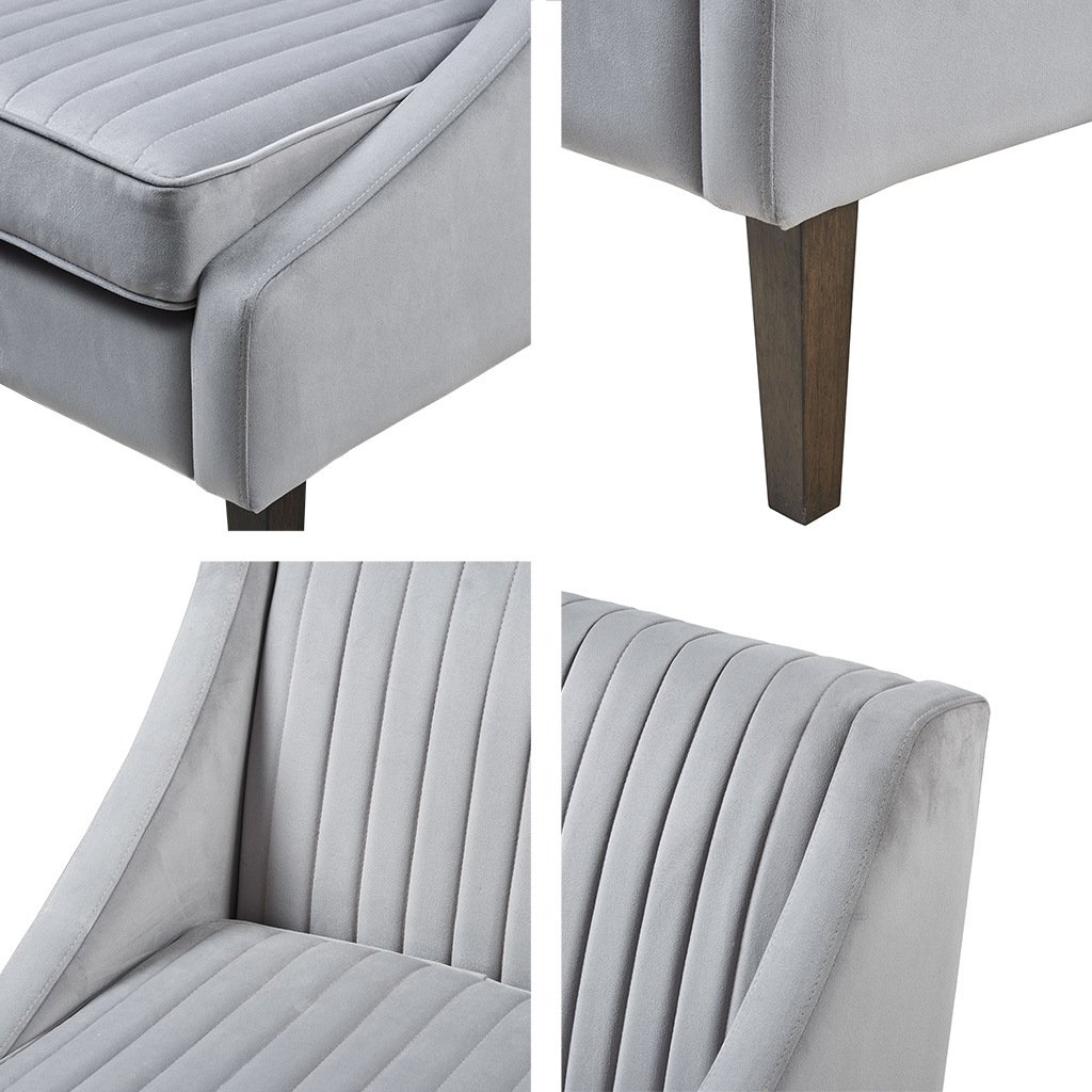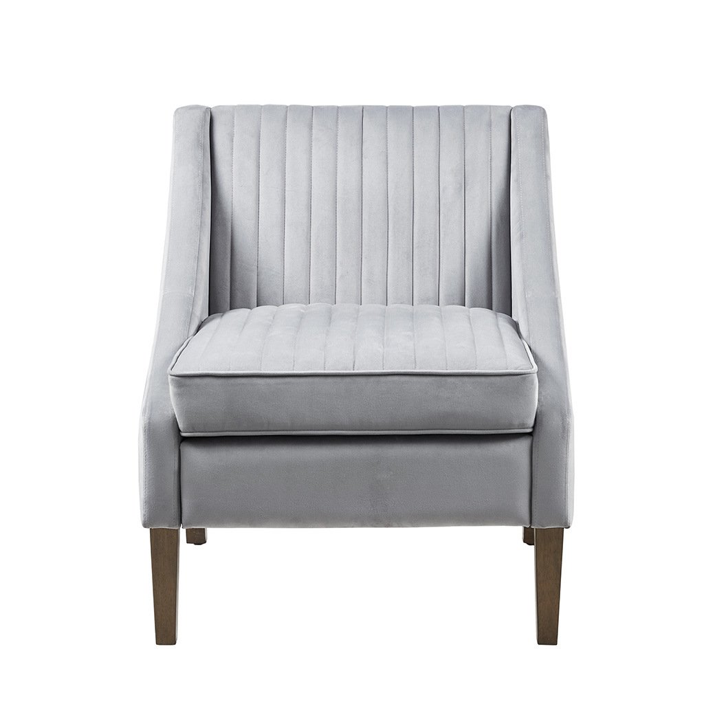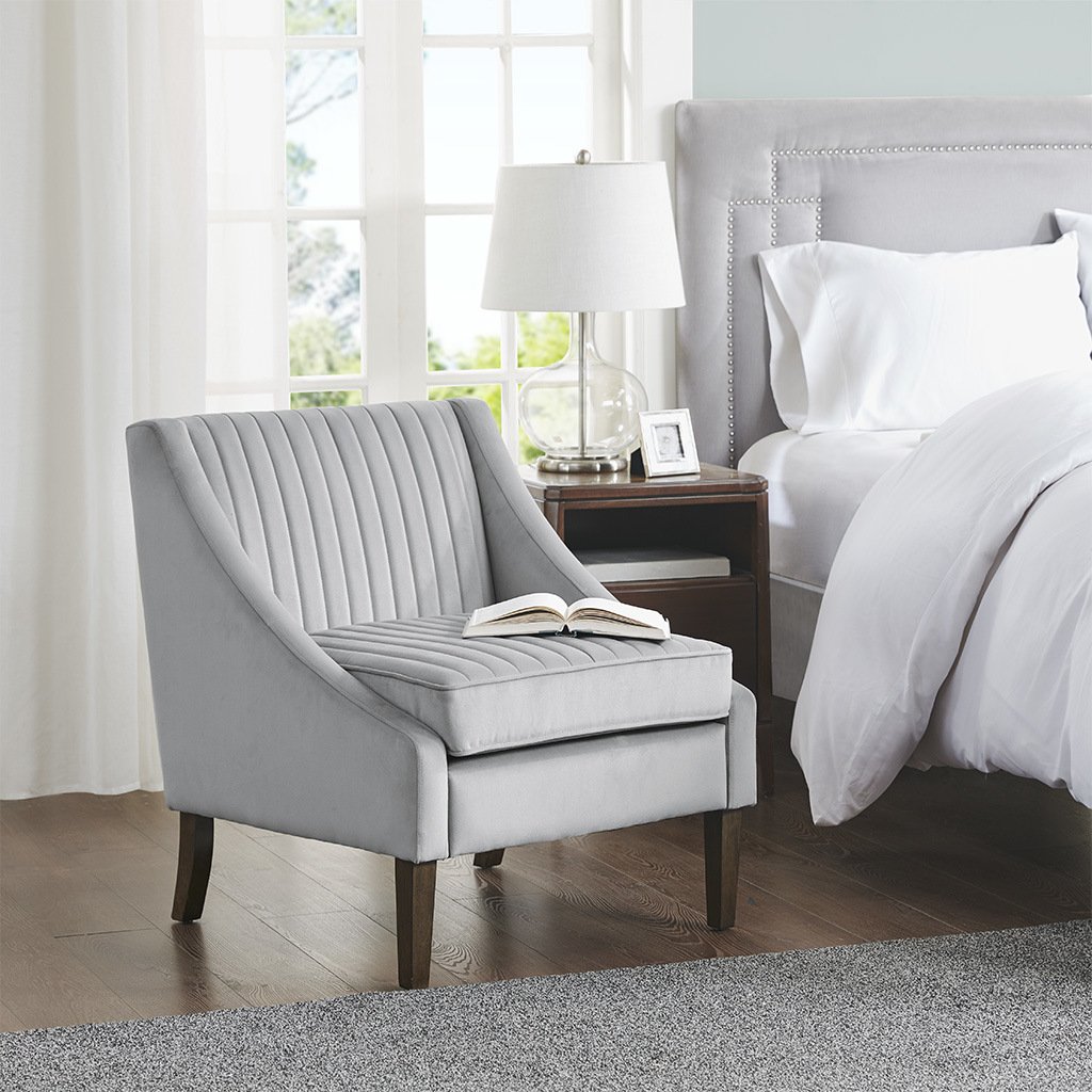 DESCRIPTIONThe Madison Park Florian Accent Chair introduces a modern, yet transitional update to your living room or bedroom. This armless accent chair features a channel back and seat upholstered in plush polyester velvet that is soft to the touch and durable. Solid wood legs in a dark coffee finish contrast the upholstery for a chic contemporary flair, while providing a sturdy base. This spacious chair offers a wide and deep seat with its removable seat cushion to provide maximum comfort and elevate your living room or bedroom. Simple assembly is required and a tool is included.PRODUCT DETAILSSee below1 Accent Chair: 27"W x 31"D x 32"HSeat Dimension: 22.5"W x 22"D x 18.5"HSeat Cushion Thickness: 5.5"TArms Size: 22.5"W x 14.5"HLegs Height: 8"HBack Rest Size: 22.5"W x 13.5"HMaximum Weight Capacity: 300LBSMATERIALFrame Composition: PlywoodLeg Material: Solid woodWood Finish: Dark coffeeArm Material: PlywoodFabric Composition: 100% polyester, velvetCushion or Upholstery Fill Material: FoamBack Fill Material: Foam