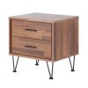 Romance CopyElevate your decor with this chic accent table featuring a modern design, complemented by sleek hairpin metal legs for a contemporary edge. Two drawers offer practical storage solutions, while the 3/4 extension design ensures easy access and efficient space utilization.Product DetailsSet includesOne (1) accent tableDimensions18.5 inches high x 20.5 inches wide x 16.5 inches deepMaterialsMDF, Partical BoardFinish colorWalnut
